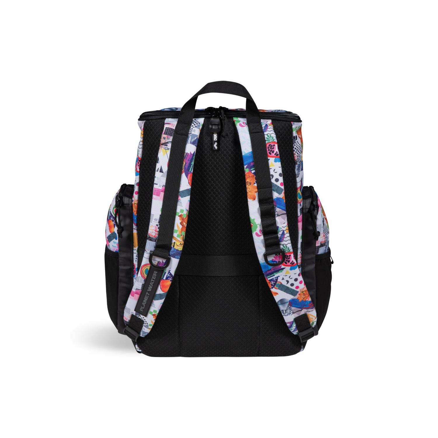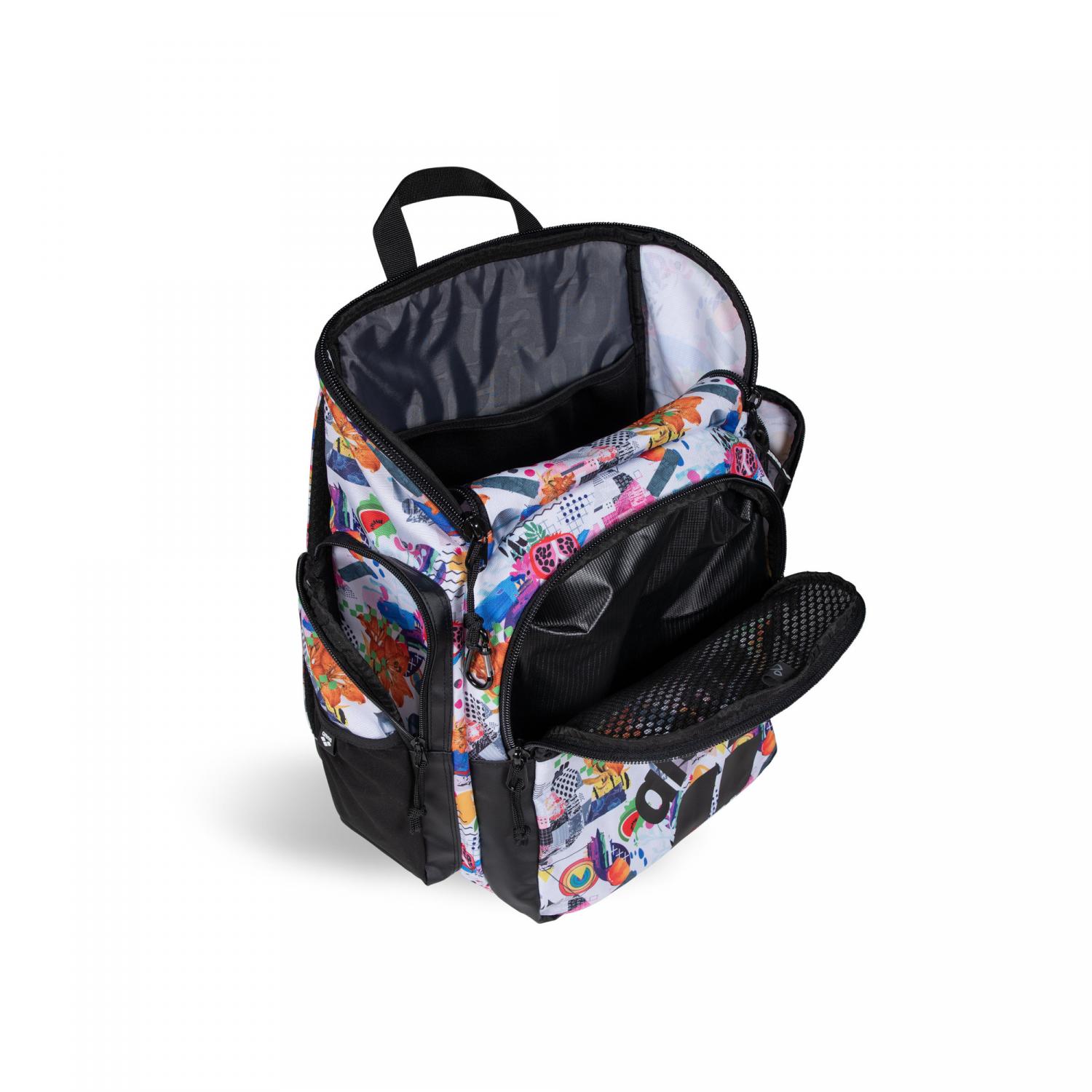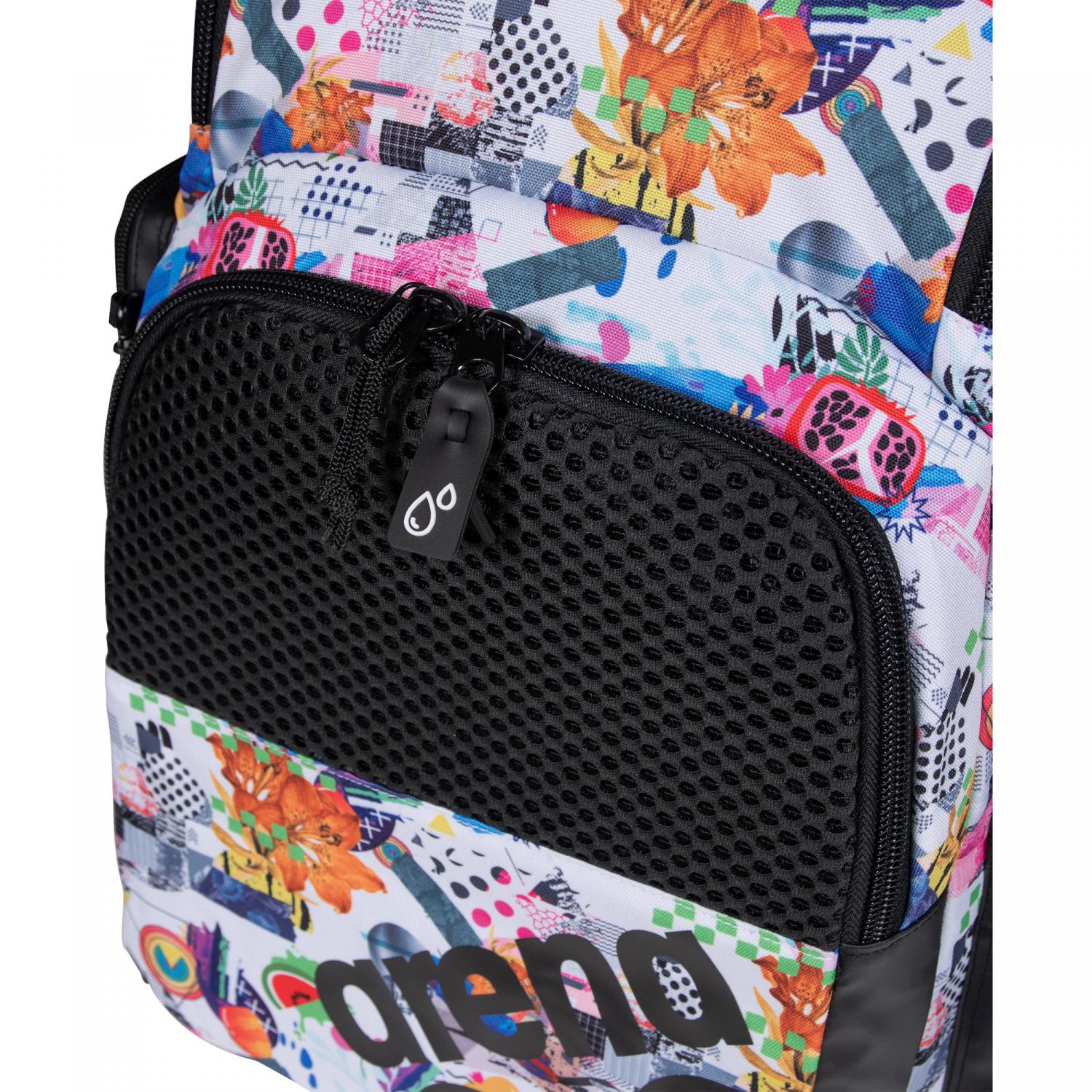 Arena Rucksack ONE GO BACKPACK 35L AO. Der praktische arena One Go Backpack Allover 35L ist ein vielseitiger und stylischer Begleiter für Schwimmbad, Fitnessstudio oder Freizeit. Dank Top-Loading-Design ist das Packen und der Zugriff auf Ihre Sachen kinderleicht. Das geräumige Hauptfach und drei externe Reißverschlusstaschen vorne ermöglichen die getrennte Aufbewahrung von nassen und trockenen Gegenständen. Ausgestattet mit einem praktischen Laptopfach und zwei externen Flaschentaschen. Aquabreathe, arenas neues Nassmanagementsystem, kombiniert atmungsaktive und wasserabweisende Stoffe zu einem fortschrittlichen Belüftungssystem, das Wasser abhält und Ihre Ausrüstung trocken hält. Die atmungsaktive Rückwand sorgt für schweißfreien Transport. Ausgestattet mit einem praktischen Gurt zur einfachen Befestigung an einem Koffer. Der wasserabweisende Boden und das Hauptgewebe bieten Schutz vor Feuchtigkeit und Schmutz. Maße: 46cm x 38cm x 23cm. Volumen: 35L. Material: 100% Polyester.