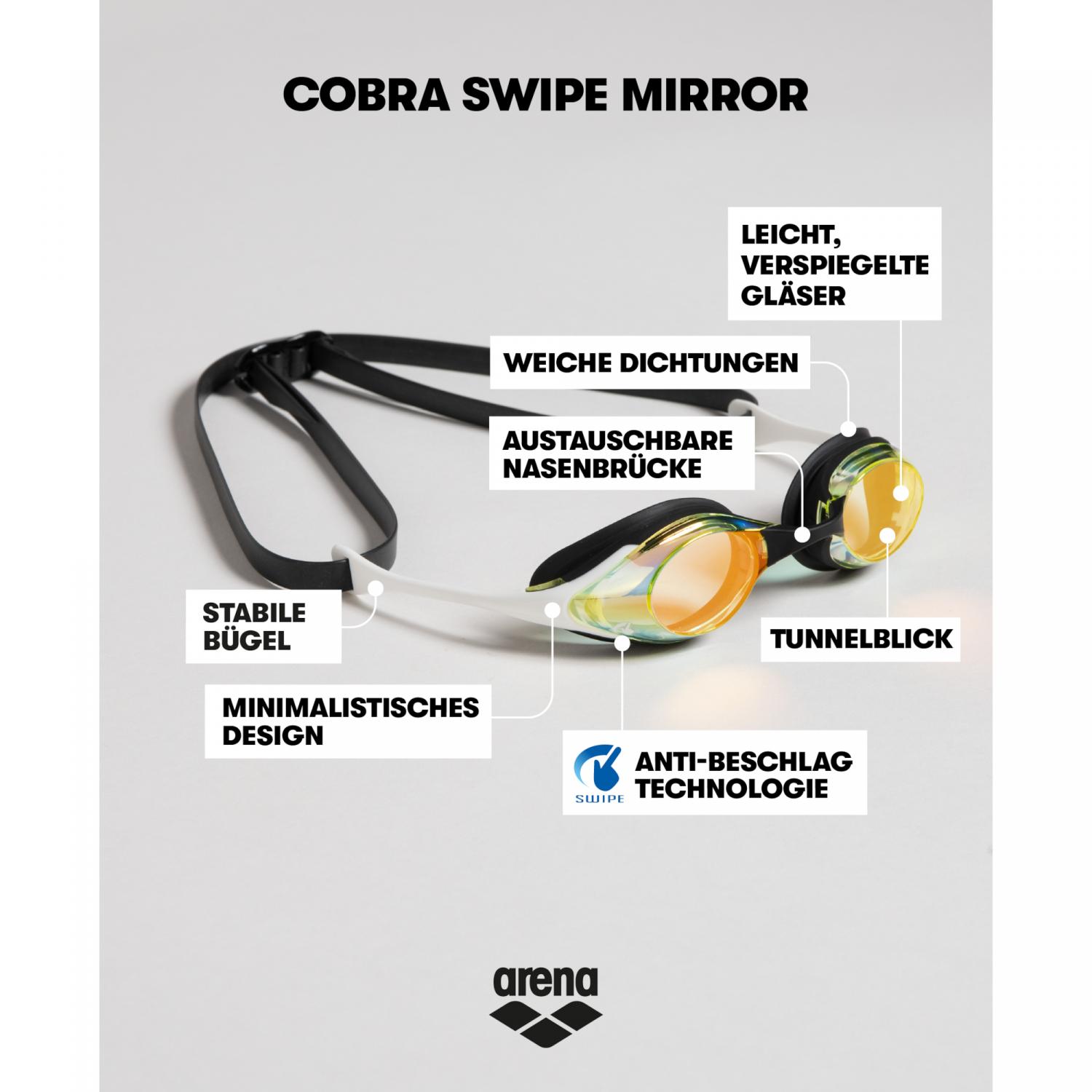 Arena Schwimmbrille Cobra Swipe Mirror. Die Swipe Anti-Fog Technologie, die bei unseren bekanntesten Rennsportbrillen eingesetzt wird, bietet überlegenen Komfort, Stabilität und Passform. Diese Art von Power-Schwimmbrillen, wie die Cobra Swipe Mirror Goggles werden von den Champions gewählt! Besondere Merkmale: flaches, verspiegeltes Glas, dünnwandige Dichtung für perfekten Komfort und wasserdichte Abdichtung, hervorragend stabile und hydrodynamische Seitenbügel, verstellbares Silikon-Doppelband für einen sicheren Sitz beim Wettkampf, auswechselbare Nasenbrücke für den optimalen Sitz. Mit UV-Schutz. Material: 70% Polycarbonat, 20% Silikon, 10% Thermoplastisches Elastomer.