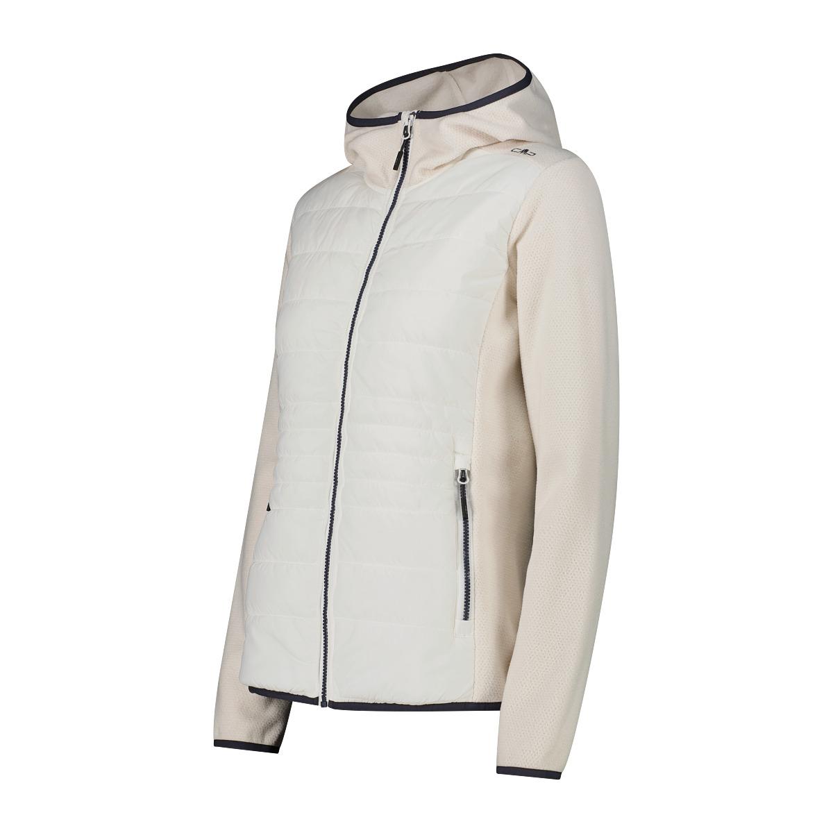 Diese CMP-Hybridjacke für Damen kombiniert technische Leistung und Komfort in einem vielseitigen Kleidungsstück für die kühleren Jahreszeiten. Die Polsterung mit Feel-Warm-Flat-Technologie bietet auch bei Nässe eine hohe Wärmeisolierung und hält den Körper warm, ohne ihn zu beschweren. Der Knit-Tech-Stoff, das Ergebnis der Kombination mehrerer Materialien, garantiert Weichheit, Atmungsaktivität und Bewegungsfreiheit. Abgerundet wird das Design durch eine fest angebrachte Kapuze, einen durchgehenden Frontreißverschluss mit winddichter Blende innen und zwei praktische Seitentaschen mit Reißverschluss. Die ergonomische Passform macht es sowohl als Zwischenschicht unter einer Jacke an kälteren Tagen als auch als Oberbekleidung für Outdoor-Ausflüge in der Übergangszeit ideal. Ein technisches und feminines Kleidungsstück, perfekt für diejenigen, die sich frei bewegen möchten, ohne auf Wärme, Stil und Funktionalität zu verzichten. Technologie: Feel Warm Flat gr.100; Knit Tech. Gewicht: 395 g. Länge: 65 cm. Material: 100% Polyester. Einsatz: 100% Polyester. Wattierung: 100% Polyester.