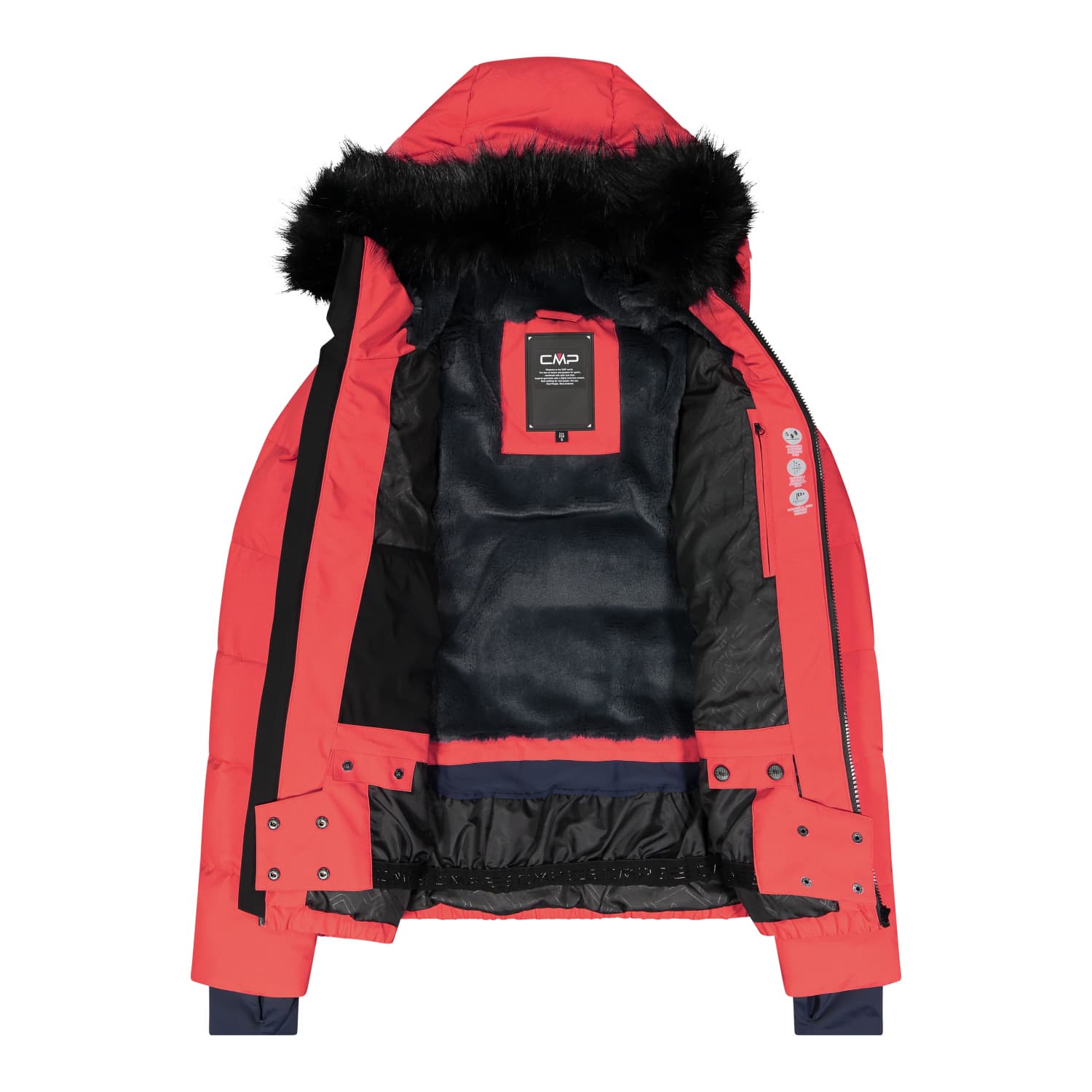 CMP Damen Twill-Skijacke mit fester Kunstfell Kapuze, gepolstert mit Feel Warm Flock, einer speziellen Kunstfaser, die den Körper auch bei Nässe warm hält. Die Clima Protect-Membran und die wasserabweisende Behandlung schützen vor Schnee und Wasser und sorgen gleichzeitig für hohe Atmungsaktivität. Das Kleidungsstück ist mit einem verstellbaren Saum, Lycra-Bündchen mit Daumenöffnung, einem Frontreißverschluss mit Wind- und Scheuerschutzleiste, zwei Seitentaschen mit Reißverschluss, einer abnehmbaren Innengamasche und einer Skipasstasche am Ärmel ausgestattet. Technologie: Water Repellent; Feel Warm Flock; Clima Protect®. Gewicht 1140 g. Länge: 68 cm. Material: 100% Polyester.