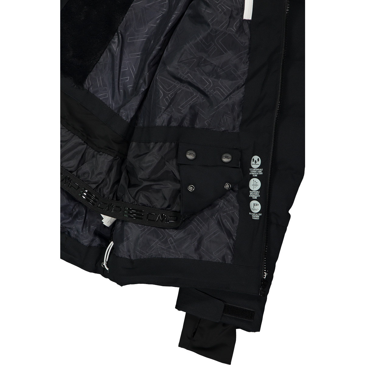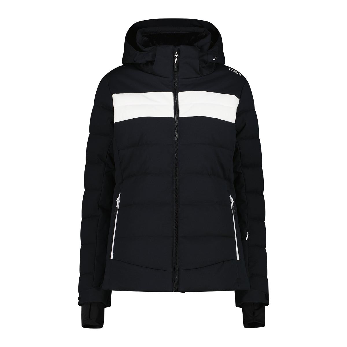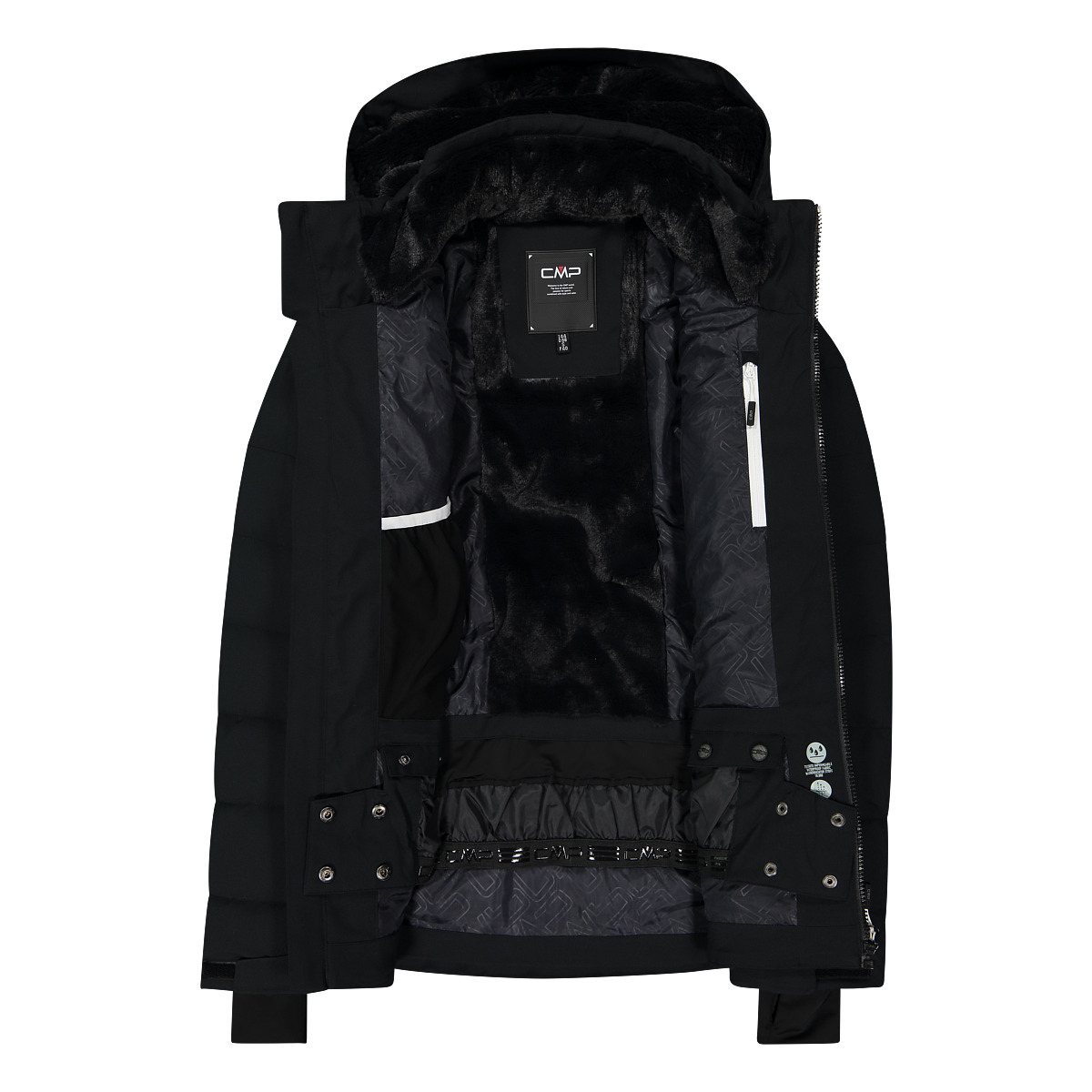 CMP Damen Skijacke aus mechanischem Stretch mit abnehmbarer Kapuze wattiert mit Feel Warm Flock, einer speziellen Synthetikfaser, die den Körper auch bei Nässe warm hält. Die Clima-Protect-Membran schützt zusammen mit der wasserabweisenden Behandlung vor Schnee und Wasser und hält die Atmungsaktivität hoch. Sowohl der WP- als auch der MVP-Index liegen bei 10.000. Das Kleidungsstück wird durch einen verstellbaren Saum, Lycra-Bündchen mit Daumenöffnung, Frontreißverschluss mit windfester Blende mit Scheuerschutz für das Kinn, zwei Seitentaschen mit Reißverschluss, abnehmbaren Innenstulpen und Skipass-Tasche am Ärmel vervollständigt. Technologie: Clima Protect®; Feel Warm Flock; Water Repellent. Gewicht: 1060 g. Länge: 70 cm. Material: 100% Polyester. Futter: 100% Polyester. Wattierung: 100% Polyester.