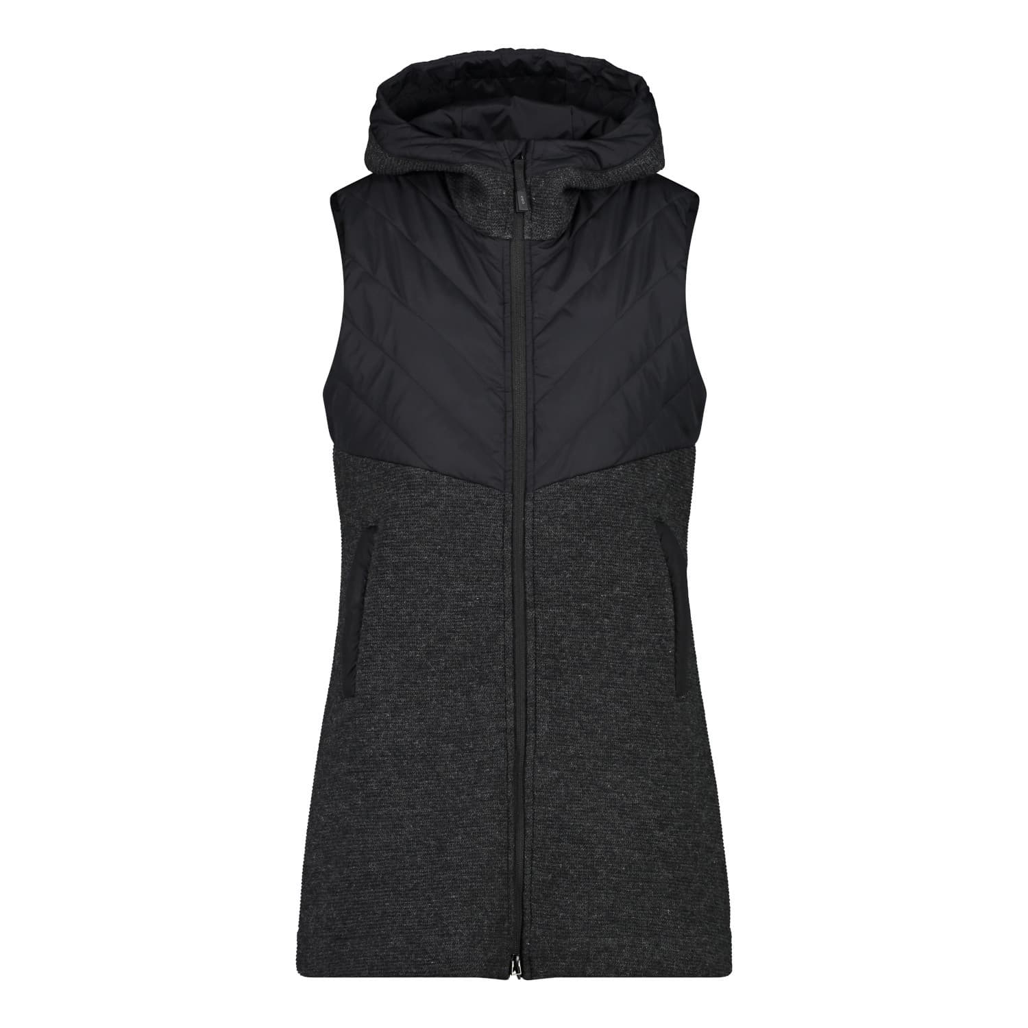 CMP Damen Weste WOMAN VEST LONG FIX HOOD. Eine moderne und urbane Weste aus Wooltech, einem Material, das das traditionelle Aussehen und die Vorteile von Wolle mit der technischen Leistung von synthetischen Fasern kombiniert. Mit Feel Warm Front- und Rückenwattierung, einer synthetischen Faser, die auch bei kalten und feuchten Bedingungen Wärme und Schutz bietet. Der Mantel ist ausgestattet mit einer festen Kapuze, hohem Kragen und zwei Seitentaschen. Material: 50% Wolle, 30% Polyester, 20% Polyamid.