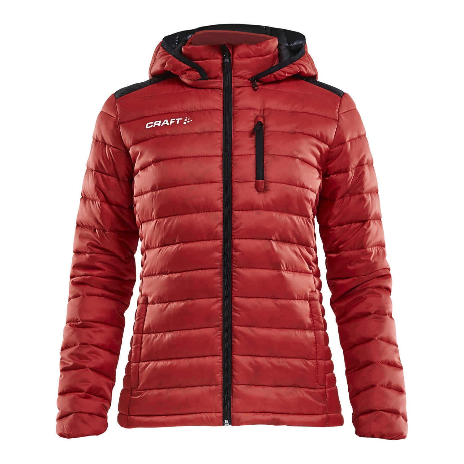 Craft Damen Steppjacke Isolate Jacket. Gepolsterte, wind- und wasserabweisende Jacke für Aufwärm- und formelle Anlässe. Mit abnehmbarer Kapuze, Brusttasche mit Reißverschluss und verstellbarem Saum. Reißverschluss mit Kinnschutz. Polsterung aus Mikrofaser mit guten thermischen Eigenschaften. Material: 100% Polyester.