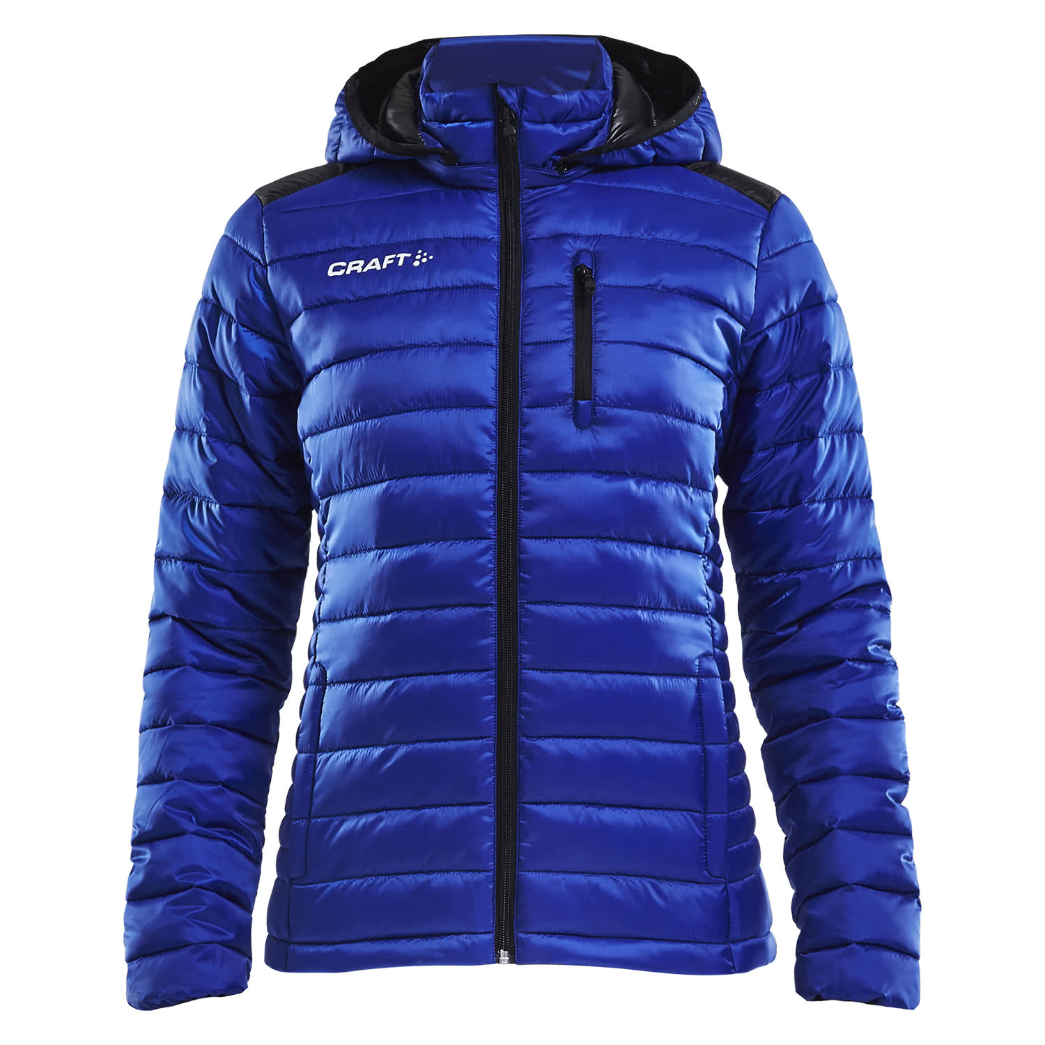 Craft Damen Steppjacke Isolate Jacket. Gepolsterte, wind- und wasserabweisende Jacke für Aufwärm- und formelle Anlässe. Mit abnehmbarer Kapuze, Brusttasche mit Reißverschluss und verstellbarem Saum. Reißverschluss mit Kinnschutz. Polsterung aus Mikrofaser mit guten thermischen Eigenschaften. Material: 100% Polyester.