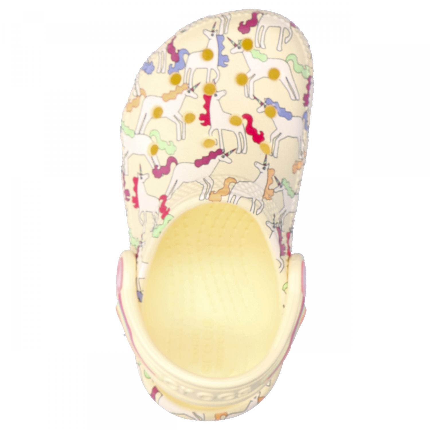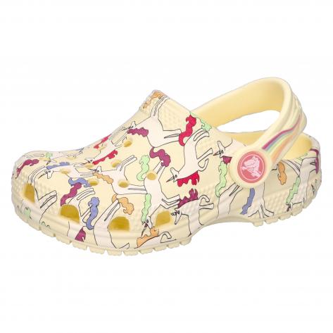 Crocs Kinder Sandale Classic Unicorn Graphic Clog T. Bring ein wenig Zauber in den Alltag deiner Kleinen. Der Einhorn-Clog verspricht magische Spielmomente mit einem durchgehenden Regenbogen-Einhorn-Print für farbenfrohe Fantasie. Leicht, bequem und einfach zu tragen – der perfekte Clog für kleine Träumer, die von Komfort und Zauber nicht genug kriegen können. Obermaterial: Sonstiges Material. Futter und Decksohle: Sonstiges Material. Laufsohle: Sonstiges Material.