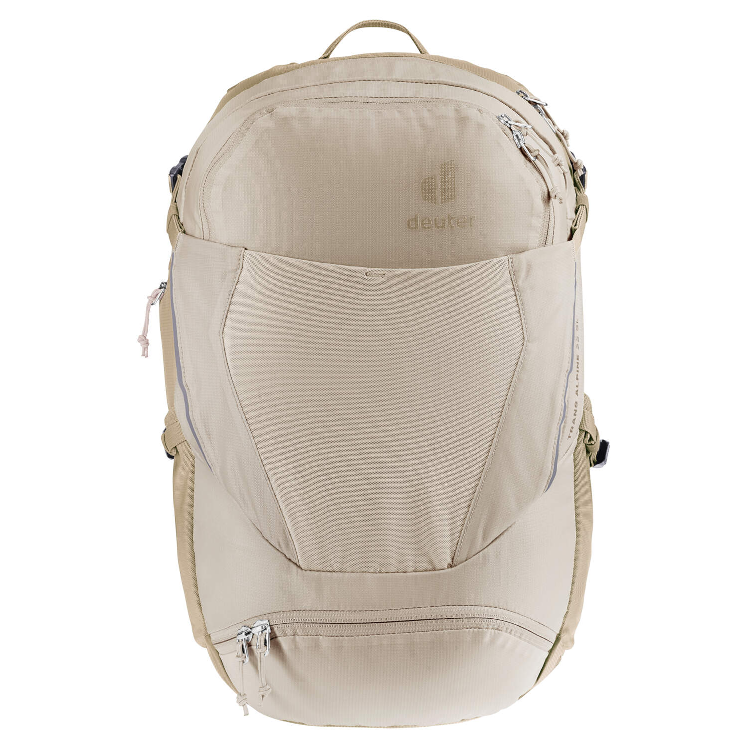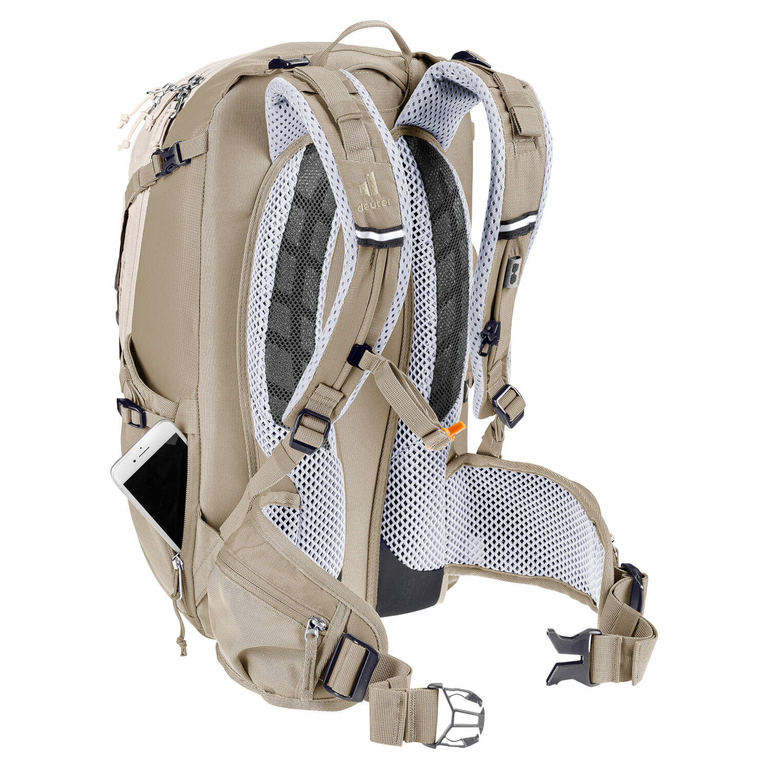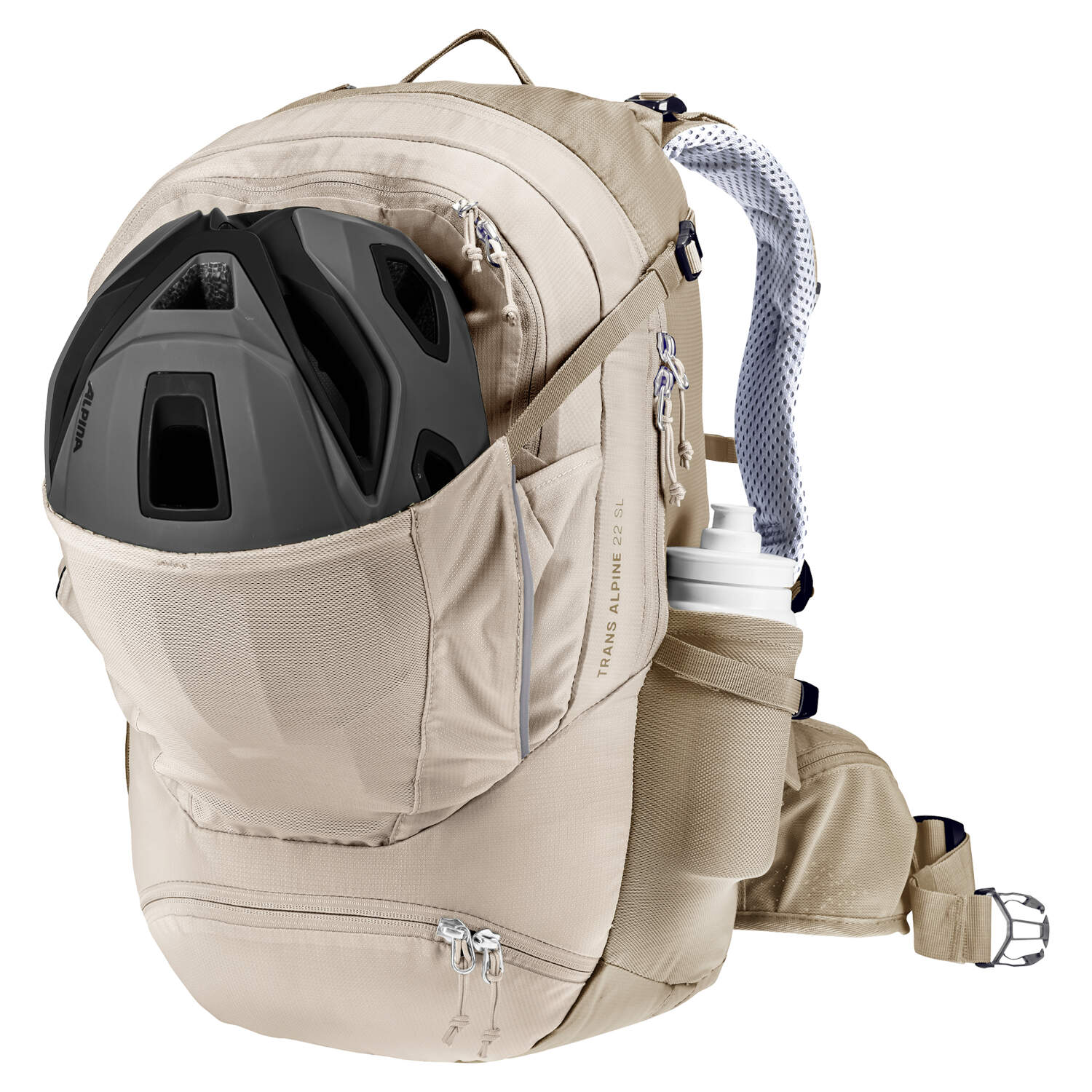 Deuter Damen Fahrradrucksack Trans Alpine 22 SL. Der Deuter Trans Alpine 22 SL ist ein durchdachter Damen-Fahrradrucksack für anspruchsvolle Mehrtagestouren und Alpenüberquerungen. Mit 22 Litern Volumen bietet er viel Stauraum und überzeugt durch eine clevere Fächeraufteilung mit Werkzeug- und Pumpenfach, funktionaler Frontstecktasche inklusive Helmhalterung sowie einem unterteilbaren Hauptfach für optimale Organisation. Das bewährte Airstripes-Rückensystem sorgt für hervorragende Belüftung und einen kompakten, sicheren Sitz – auch auf sportlichen Trails. Ergonomisch gepolsterte Schulterträger, anschmiegsame Hüftflossen, Lageverstellriemen und ein stufenlos verstellbarer Brustgurt garantieren hohen Tragekomfort. Praktische Details wie eine seitliche Smartphone-Tasche, ein Reißverschlussfach für die Luftpumpe, Trinksystem-Kompatibilität bis 3 Liter, abnehmbare Regenhülle, reflektierende Elemente sowie eine herausnehmbare Sitzmatte machen den Rucksack besonders vielseitig. Mit einem Gewicht von 1140 g und nachhaltigen, bluesign®-zertifizierten Materialien verbindet der Trans Alpine 22 SL Funktionalität, Komfort und ressourcenschonende Herstellung auf höchstem Niveau. Gewicht: 1140 g. Volumen: 22 l. H/B/T: 50 x 26 x 20 cm.