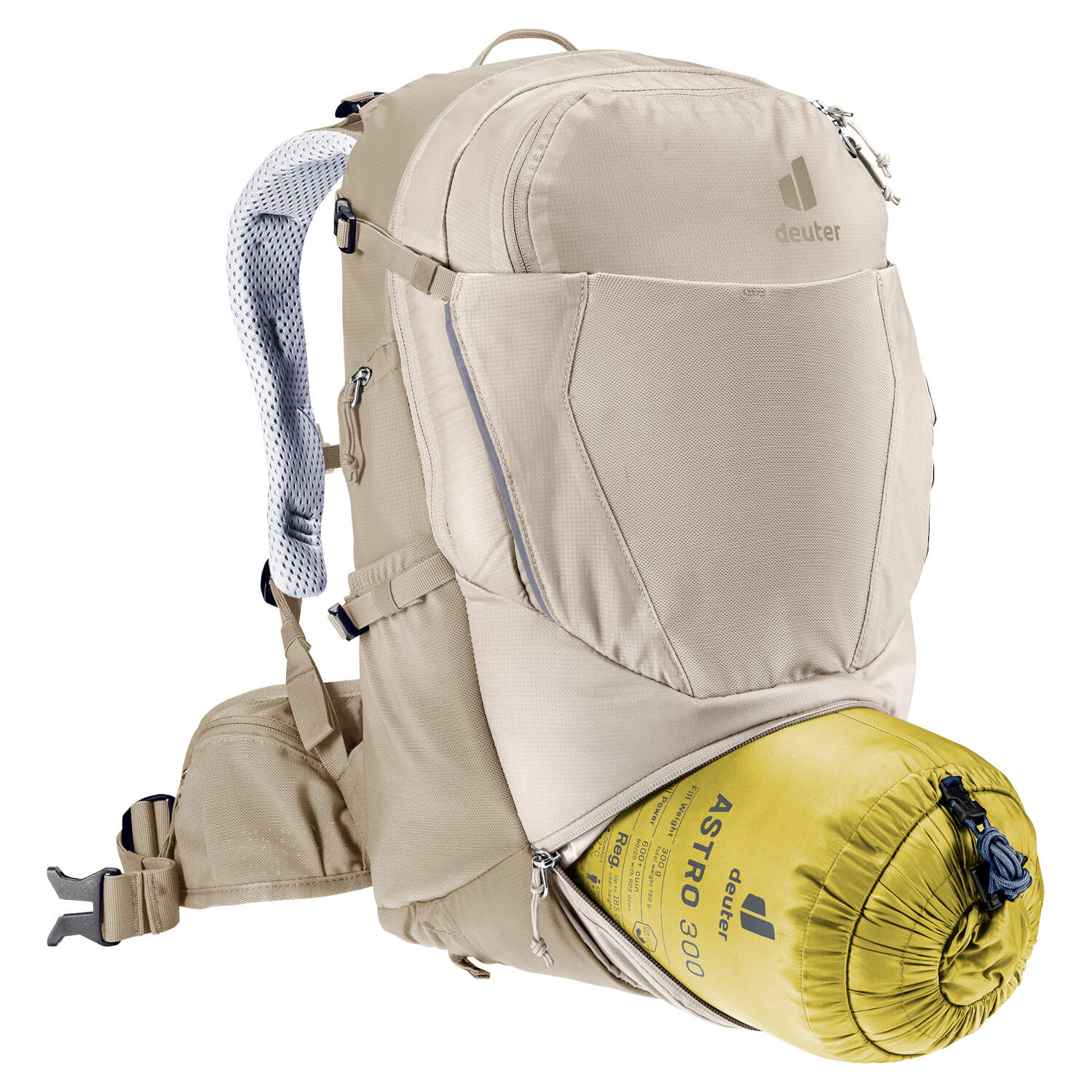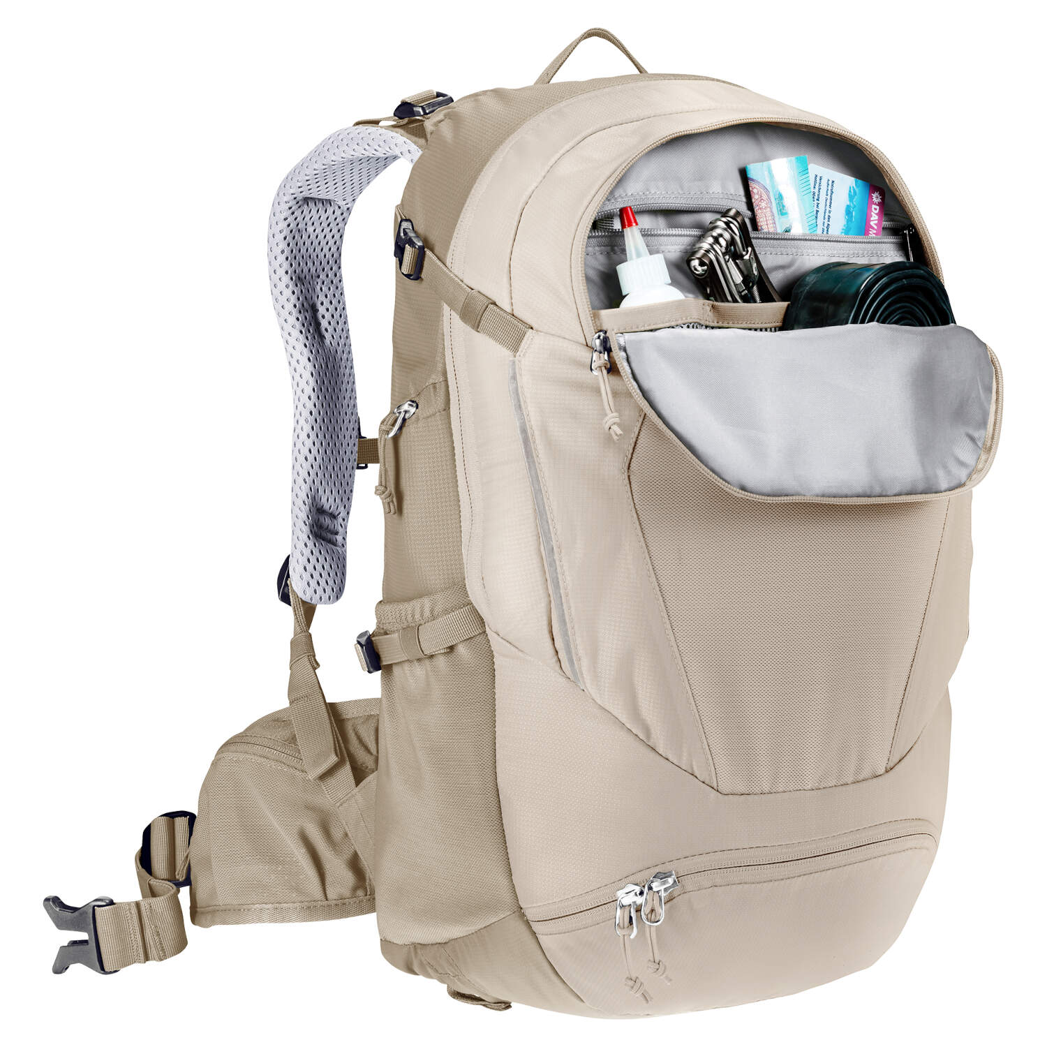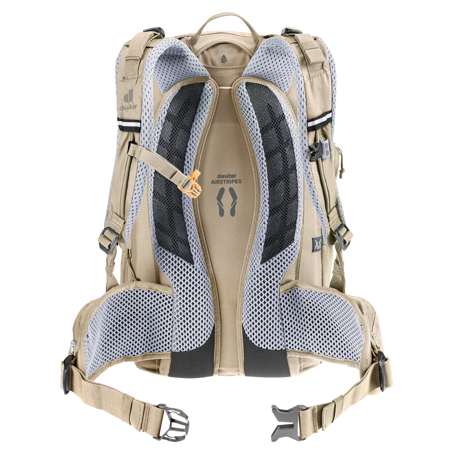 Deuter Damen Fahrradrucksack Trans Alpine 22 SL. Der Deuter Trans Alpine 22 SL ist ein durchdachter Damen-Fahrradrucksack für anspruchsvolle Mehrtagestouren und Alpenüberquerungen. Mit 22 Litern Volumen bietet er viel Stauraum und überzeugt durch eine clevere Fächeraufteilung mit Werkzeug- und Pumpenfach, funktionaler Frontstecktasche inklusive Helmhalterung sowie einem unterteilbaren Hauptfach für optimale Organisation. Das bewährte Airstripes-Rückensystem sorgt für hervorragende Belüftung und einen kompakten, sicheren Sitz – auch auf sportlichen Trails. Ergonomisch gepolsterte Schulterträger, anschmiegsame Hüftflossen, Lageverstellriemen und ein stufenlos verstellbarer Brustgurt garantieren hohen Tragekomfort. Praktische Details wie eine seitliche Smartphone-Tasche, ein Reißverschlussfach für die Luftpumpe, Trinksystem-Kompatibilität bis 3 Liter, abnehmbare Regenhülle, reflektierende Elemente sowie eine herausnehmbare Sitzmatte machen den Rucksack besonders vielseitig. Mit einem Gewicht von 1140 g und nachhaltigen, bluesign®-zertifizierten Materialien verbindet der Trans Alpine 22 SL Funktionalität, Komfort und ressourcenschonende Herstellung auf höchstem Niveau. Gewicht: 1140 g. Volumen: 22 l. H/B/T: 50 x 26 x 20 cm.