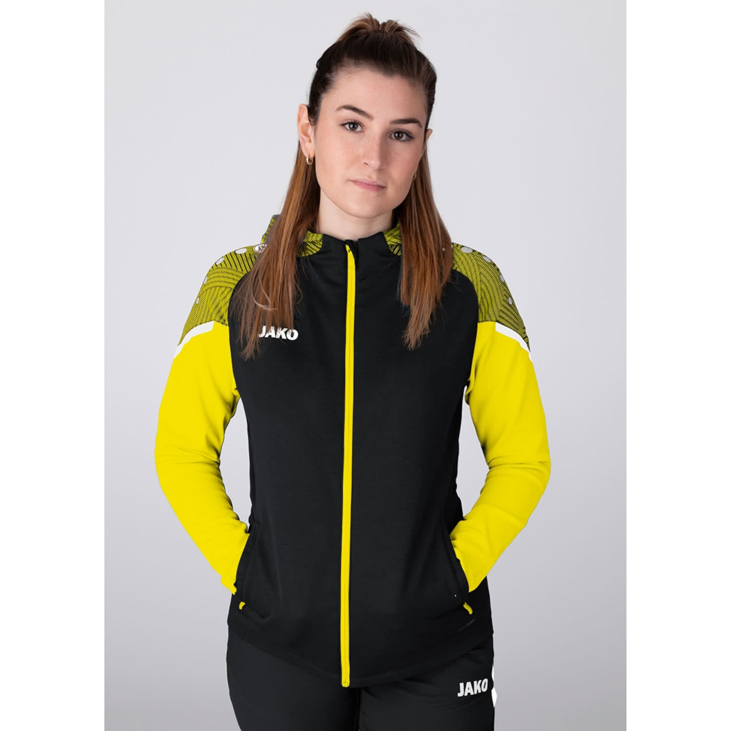 Jako Damen Kapuzenjacke Performance. Nachhaltige Kapuzenjacke mit zahlreichen Details. Die Highlights der JAKO Kapuzenjacke Performance sind die Design-Elemente im Schultereinsatz aus Jacquard und die Kontraststreifen. Diese Design-Elemente sind ebenfalls in der Kapuze eingearbeitet. Die Kapuzenjacke verfügt über Seitentaschen mit Reißverschluss. 100 % der eingesetzten Materialien der Jacke bestehen aus recyceltem Polyester. Durch das Polyester-Fleece besitzt der Stoff eine weiche Oberfläche, die nur sehr wenig Feuchtigkeit aufnimmt und Schweiß zuverlässig nach außen transportiert. Material: 100% Polyester.