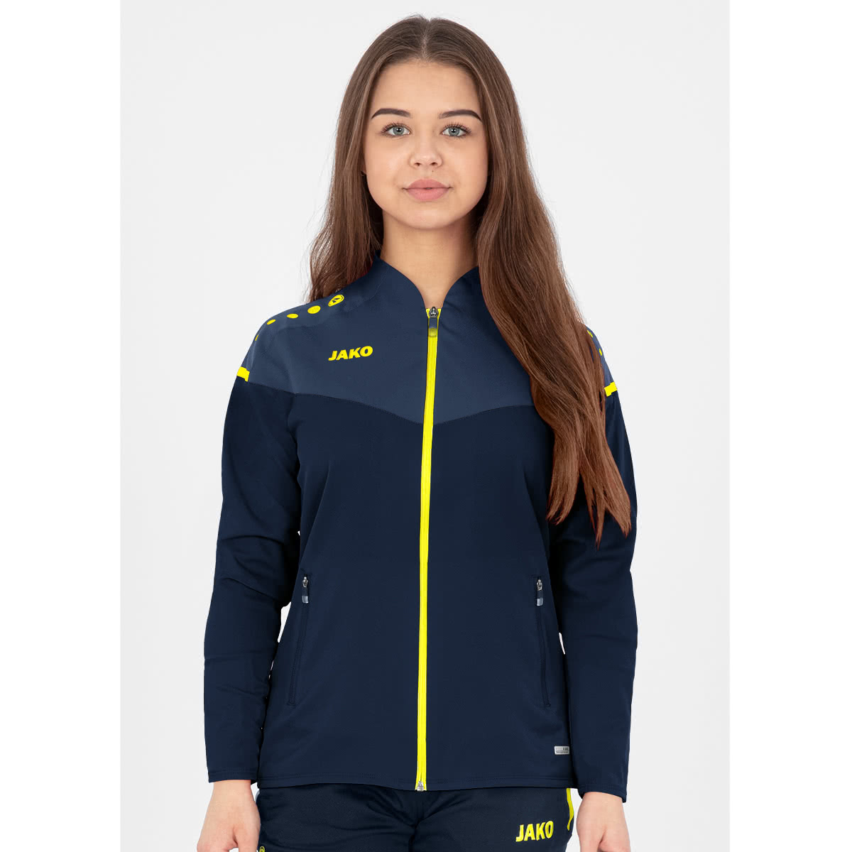 Jako Damen Präsentationsjacke Champ 2.0. Mit der Teamline CHAMP 2.0 wird der Teamauftritt zum absoluten Highlight. Funktionale Materialien und passgenaue Schnitte runden das sportive Design ab. Seitentaschen mit Reißverschluss. Modischer V-Neck. Zweifarbige Reißverschlussanhänger. Zippergarage. Kontraststreifen am Ärmel. Kontrast-Tape am Nacken. Performance Label. Ladies Fit. Stretch-Micro-Twill. Innenfutter: Waffl e-Mesh, 100% Polyester. Material: 100% Polyester.