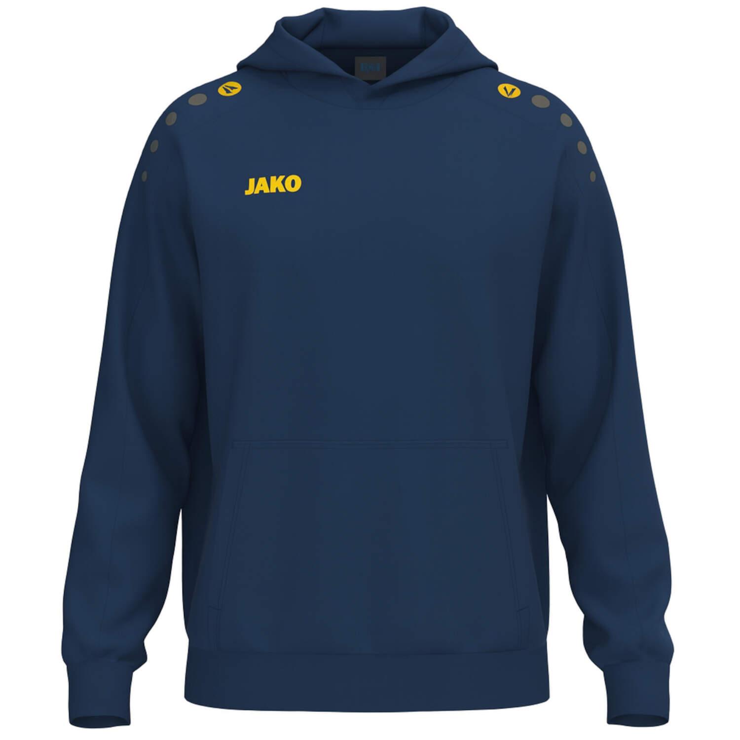 Jako Kinder Kapuzenpullover One Cotton. Der Kapuzensweat One Cotton überzeugt durch sein klassisches Design und hohen Tragekomfort. Die JAKO Dots auf der Schulter und das JAKO-Logo auf der rechten Brust verleihen dem Hoodie einen sportlich-modernen Look. Die weich angeraute Innenseite sorgt für ein besonders angenehmes Tragegefühl und hält zuverlässig warm – ideal für Freizeit, Aufwärmphasen oder den Alltag. In der aufgesetzten Tasche finden Hände oder kleine Essentials bequem Platz. Dank seines schlichten und hochwertigen Designs ist der Kapuzensweat ideal zum Veredeln, etwa mit Vereinslogo, Initialen oder Firmenbranding. Ob beim Sport, in der Freizeit oder auf dem Weg ins Training – der Kapuzensweat One Cotton vereint Komfort, Funktion und Stil perfekt. Jetzt entdecken und deinen Kapuzensweat One Cotton individuell gestalten. Material: 60% Baumwolle, 40% Polyester.
