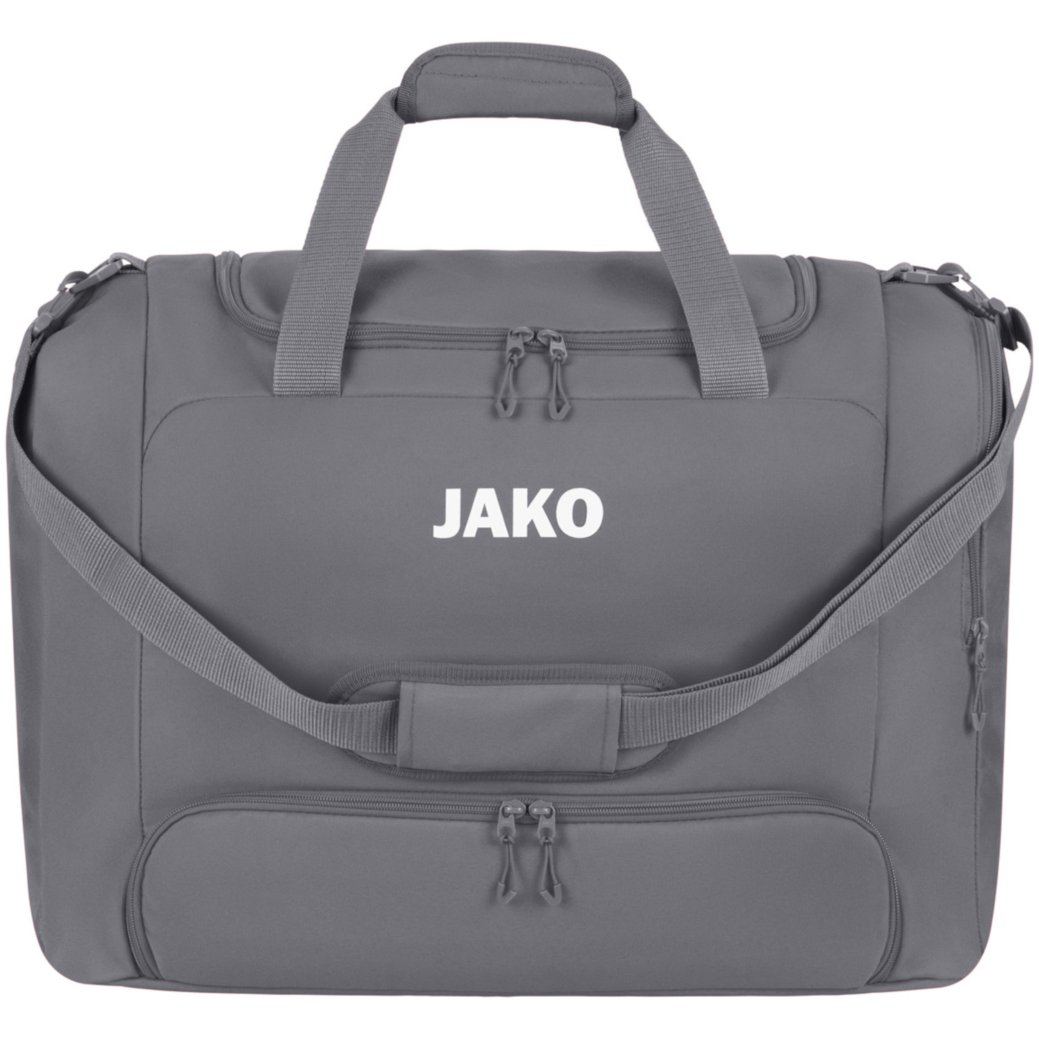 Jako Sporttasche One mit Bodenfach. Die Sporttasche One mit Bodenfach bietet alles, was du für Training, Wettkampf oder Reisen brauchst. Das geräumige Hauptfach mit umlaufendem 2-Wege-Reißverschluss sorgt für einfachen Zugriff und viel Stauraum. Im integrierten Bodenfach lassen sich Schuhe oder nasse Kleidung hygienisch getrennt aufbewahren. Zusätzlich bietet eine seitliche Reißverschlusstasche Platz für kleinere Gegenstände, während die Innentasche mit Reißverschluss Wertsachen sicher verstaut. Der verstellbare Schultertragegurt garantiert optimalen Tragekomfort. Hergestellt aus recyceltem Polyester, überzeugt die Tasche durch Strapazierfähigkeit, Nachhaltigkeit und modernes Design. Ob im Fitnessstudio, auf dem Spielfeld oder unterwegs – die Sporttasche One mit Bodenfach ist dein idealer Begleiter für jede Situation. Jetzt entdecken und perfekte Organisation mit Stil erleben. Maße: Bambini S: 42 x 24 x 30 cm (LxBxH). Junior M: 52 x 28 x 38 cm (LxBxH). Senior L: 62 x 32 x 42 cm (LxBxH). Volumen: S: 30 Liter. M: 55 Liter. L: 83 Liter. Material: 100% Polyester.