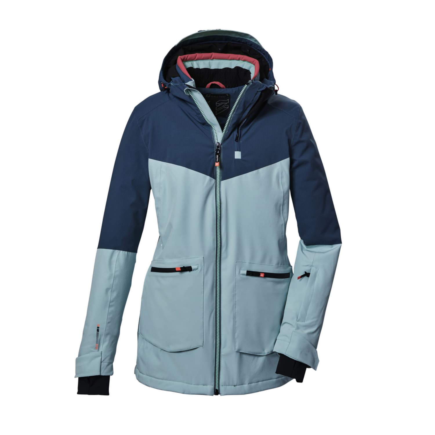 killtec Damen Skijacke KSW 40 WMN SKI JCKT. Die Damen Skijacke von killtec macht auf jeder Piste eine gute Figur und punktet durch ihre funktionalen Eigenschaften. Die Jacke hat verschweißte Nähte und einen wasserfesten Reißverschluss und ist mit einer 10.000 mm Wassersäule wasser- und winddicht (Tipp: ab und zu sollte die Jacke neu imprägniert werden). Sie ist außerdem besonders atmungsaktiv (10.000 g/m²/24 h). Die Unterarmventilation sorgt zusätzlich für ein gutes Körperklima. Innen ist die Jacke mit einem rutschfesten Schneefang, einer Skibrillentasche und einer Handytasche ausgestattet. Vier Zippertaschen bieten weiteren Stauraum. Die Weite von Kapuze und Saum ist regulierbar. Lycracuffs mit Daumenösen an den verstellbaren Ärmelabschlüssen verhindern das Eindringen von Kälte und Wind. killtec liegt es besonders am Herzen, die Kollektionen nachhaltiger und zukunftsfähiger zu machen. So setzt killtec verstärkt auf verantwortungsbewusstere Herstellungsverfahren. Diese Jacke ist daher PFC-frei und wurde teilweiseaus recyceltem Material hergestellt. Material: 93% Polyester, 7% Elasthan.