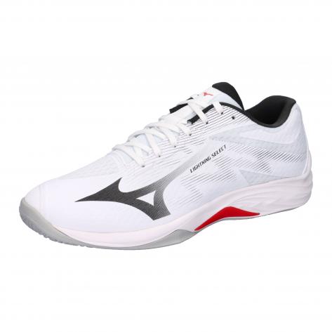 Mizuno Unisex Hallenschuhe LIGHTNING SELECT. Die Mizuno Unisex Trainingsschuhe Lightning Select bieten gepolsterten Komfort bei geringem Gewicht und eignen sich ideal für Anfänger und fortgeschrittene Spieler, insbesondere für Wing Spiker. Das Modell ist die Weiterentwicklung des bisherigen Thunder Blade Z und wurde vom leistungsstarken Spitzenmodell Wave Lightning Elite inspiriert. Das neu entwickelte dreilagige Mesh-Obermaterial sorgt für eine nahtlose, den Fuß umschließende Passform und wird durch den Dyna-Eyelet Wrap ergänzt, der dank seiner großflächigen Ösenstruktur den gesamten Fuß stabil umschließt und zusätzlichen Komfort bietet. Die flache Sohle fördert ein sicheres und stabiles Spielgefühl, während die Outrigger-Struktur, bei der sich die Sohle im Bereich der kleinen Zehe nach außen erstreckt, zusätzliche Unterstützung und Halt auf dem Spielfeld gewährleistet. Mit einem Gewicht von etwa 520 g verbindet der Lightning Select Leichtigkeit mit Stabilität und vereint die einsteigerfreundliche Auslegung mit der bewährten DNA des Elite-Modells Wave Lightning Elite. Obermaterial: Sonstiges Material, Textil. Futter und Decksohle: Textil. Laufsohle: Sonstiges Material.