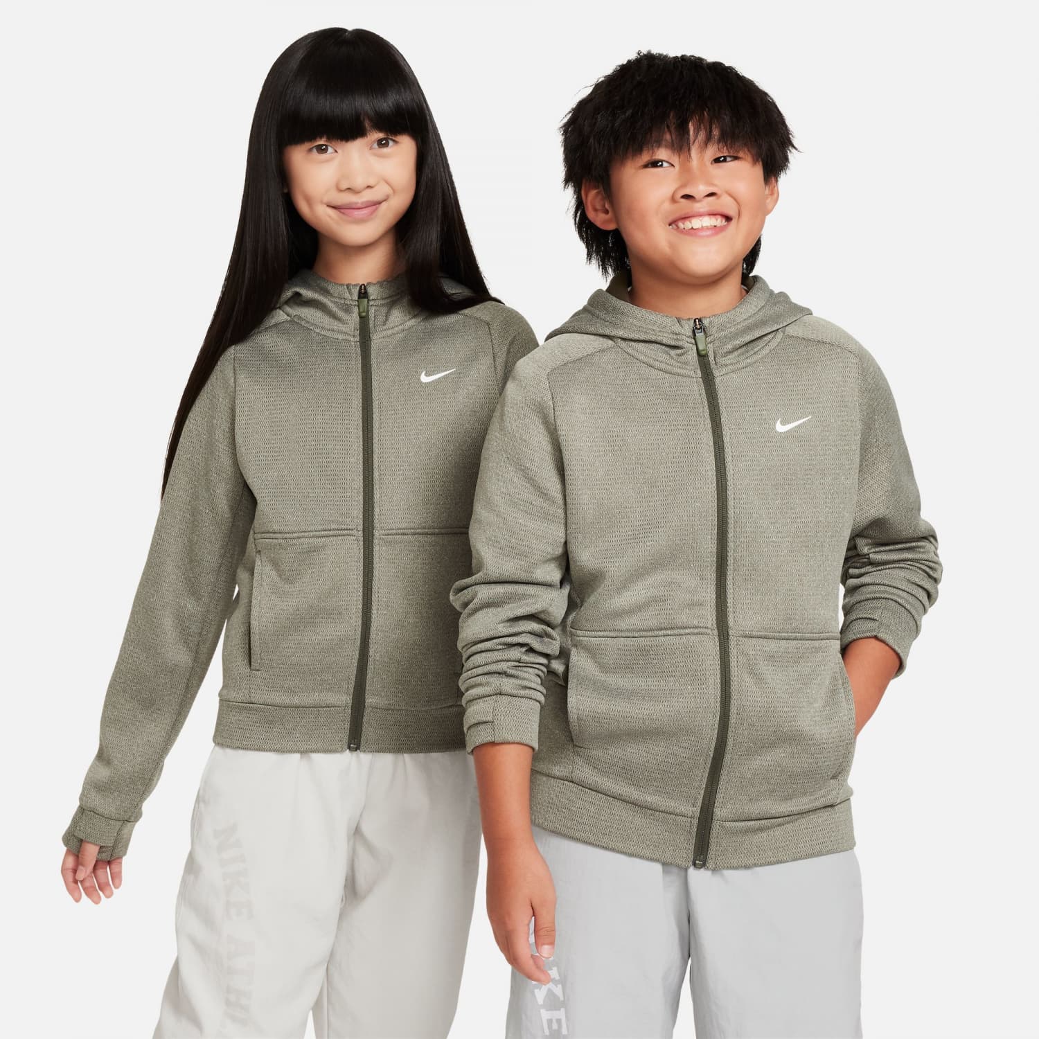 Nike Kinder Kapuzenjacke Therma-Fit Full Zip LS Top. Spiel wie die Profis in diesem bequemen Therma-FIT Hoodie. Dieses Fleece ist an der Außenseite besonders geschmeidig und innen für immer flauschig warm. Es wurde für das Spielen in der Kälte entwickelt, damit du auch bei niedrigeren Temperaturen länger draußen bleiben kannst. Ein dezenter Glanz und zusätzliche Wärme sorgen für zusätzlichen Style und Tragekomfort, damit du bei jedem Wetter dein Bestes geben kannst und dabei gut aussiehst. Nike Therma-FIT-Technologie nutzt deine natürliche Körperwärme, um dich bei kaltem Wetter warm zu halten. Das gerippte Finish an Bündchen, Kragen und Saum sorgt für kuscheligen Tragekomfort. Schließe den Reißverschluss für mehr Wärme oder öffne ihn, wenn du ein kühleres, atmungsaktiveres Tragegefühl benötigst. Material: 100% Polyester.
