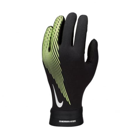 Nike Kinder Fussballhandschuhe Y NK ACDMY THERMAFIT-HO24. Lass dich nicht von kaltem Wetter von deinem Training abhalten. Durch die Therma-FIT-Technologie bleiben deine Hände warm und deine Körpertemperatur wird reguliert. Die flexiblen Bündchen bieten einen sicheren Halt und schließen die Wärme ein. Die Nike Therma-FIT-Technologie nutzt deine natürliche Körperwärme, damit du auch bei kaltem Wetter warm bleibst. Strukturierte Handinnenflächen sorgen für besseren Grip. Material: 62% Polyester, 28% Polyamid, 5% Gummi, 5% Elasthan.