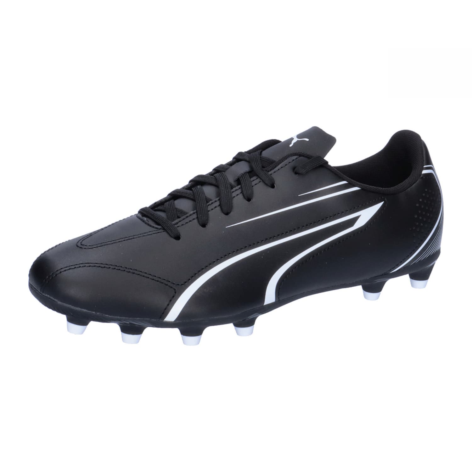 Puma Herren Fußballschuhe Vitoria FG/AG. Modernes Design, pflegeleichter Fußballschuh: der VITORIA. Das weiche, robuste Synthetikmaterial sorgt für Tragekomfort, während die Dekostickerei und Print-Details den Style abrunden. Obermaterial aus Synthetik. Klassische Schuhzunge für verschiedene Fußtypen. Leichte TPU-Laufsohle mit konischen Stollen. Regular Fit. FG/AG: geeignet für festen Boden und Kunstrasen (Firm Ground/Artificial Ground). Obermaterial: Textil; Sonstiges Material. Futter und Decksohle: Textil. Laufsohle: Sonstiges Material.