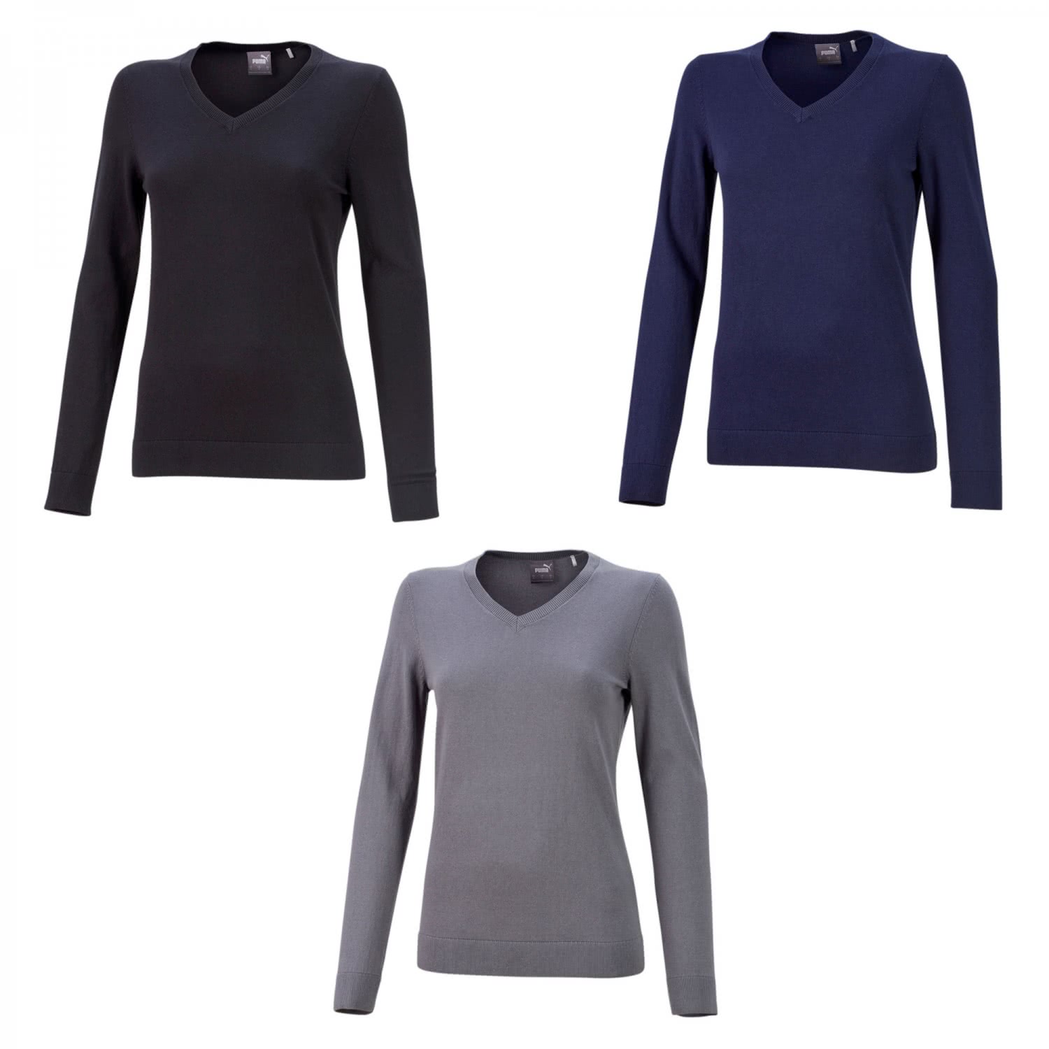 Puma Damen Pullover Team Sweater. Der vielseitige PUMA Team Sweater vereint Funktionalität mit Style und bietet allen Golfern vollen Schutz bei voller Bewegungsfreiheit. Gerippter V-Ausschnitt. Rippbündchen und Saum. Gesticktes PUMA Cat Logo im Nacken. Normale Passform. Material: 89% Polyester, 11% Elasthan.