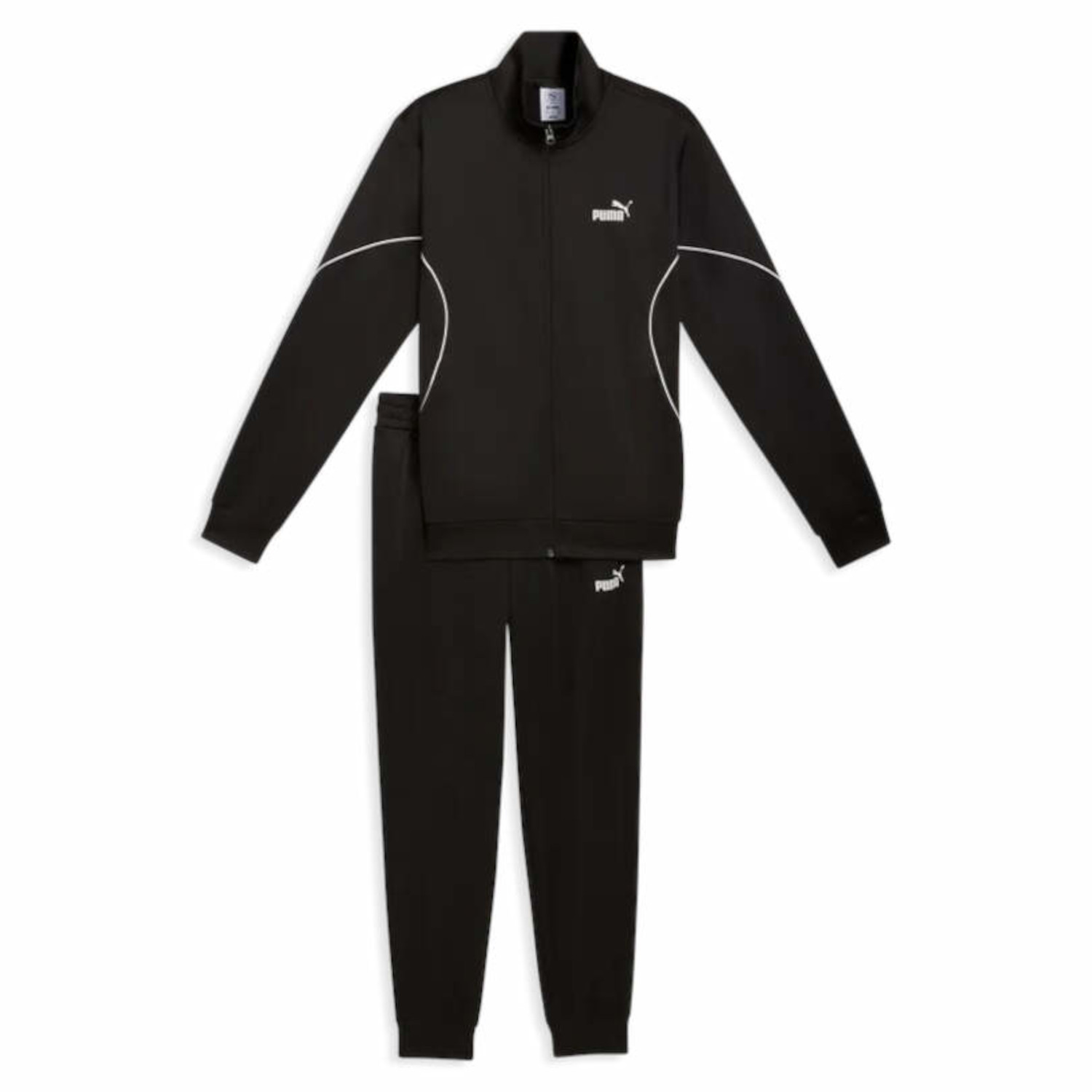 Puma Herren Trainingsanzug Poly Piping Suit. Der Puma Herren Trainingsanzug Poly Piping Suit vereint sportliche Inspiration mit einem modernen, alltagstauglichen Stil. Er überzeugt durch einen klassischen Look mit zeitgemäßem Akzent und eignet sich ideal für Komfort und Bewegungsfreiheit im täglichen Gebrauch. Ob beim Aufwärmen, unterwegs oder in der Freizeit – dieser Trainingsanzug passt sich jeder Situation mühelos an und unterstreicht mit seiner typischen Puma-Attitüde ein selbstbewusstes Auftreten in Bewegung. Der Anzug besteht aus hochwertigem Trikotmaterial in regulärer Passform und verfügt über einen Stehkragen, lange Ärmel sowie einen durchgehenden Reißverschluss. Praktische Seitentaschen bieten Platz für kleine Essentials. Die normale Länge und die mittlere Leibhöhe sorgen für angenehmen Sitz und hohen Tragekomfort. Im Rahmen des RE:FIBRE-Programms wird das Kleidungsstück aus mindestens 95 % recycelten Materialien aus Textilabfällen und anderen wiederverwendeten Materialien hergestellt. Das Material besteht aus 100 % Polyester.