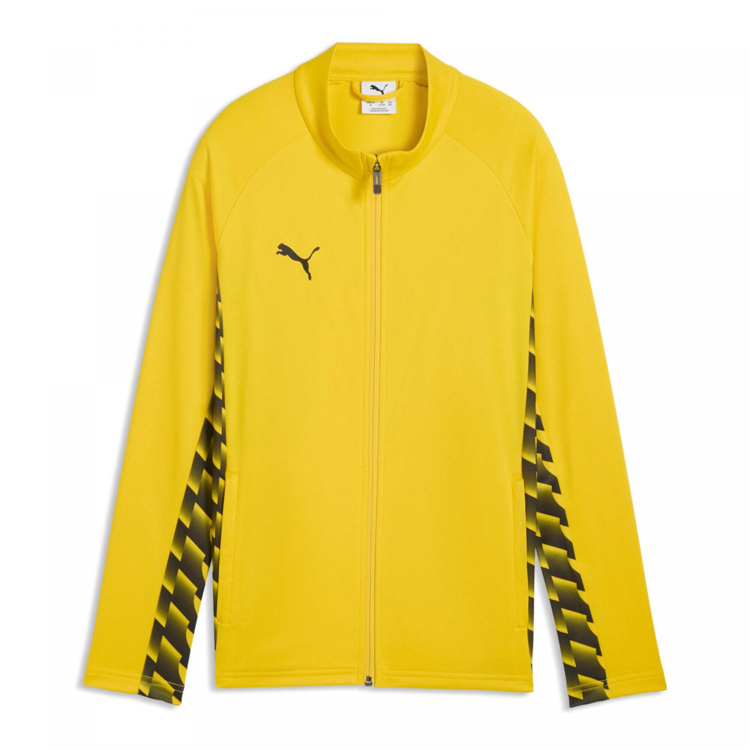 Die Puma Kinder Trainingsjacke teamLIGA26 Training Jacket vereint sportliche Funktionalität mit modernem Design und ist ideal für Training und Freizeit. Die körpernahe Slim-Fit-Passform sorgt für eine optimale Bewegungsfreiheit und einen dynamischen Look. Dank der integrierten dryCELL Technologie wird Feuchtigkeit zuverlässig vom Körper abgeleitet, sodass du auch bei intensiven Einheiten angenehm trocken bleibst. Das leichte Material aus 100 % recyceltem Polyester bietet hohen Tragekomfort und unterstützt nachhaltige Ansprüche. Ein durchgehender Reißverschluss und der Stehkragen ermöglichen individuellen Schutz und einfaches An- und Ausziehen. Praktische Seitentaschen mit Reißverschluss bieten sicheren Stauraum, während Seiten- und Unterarmpaneele mit PUMA Formstripe-inspiriertem Grafikdruck für einen sportlichen Look sorgen. Material: 100% Polyester.