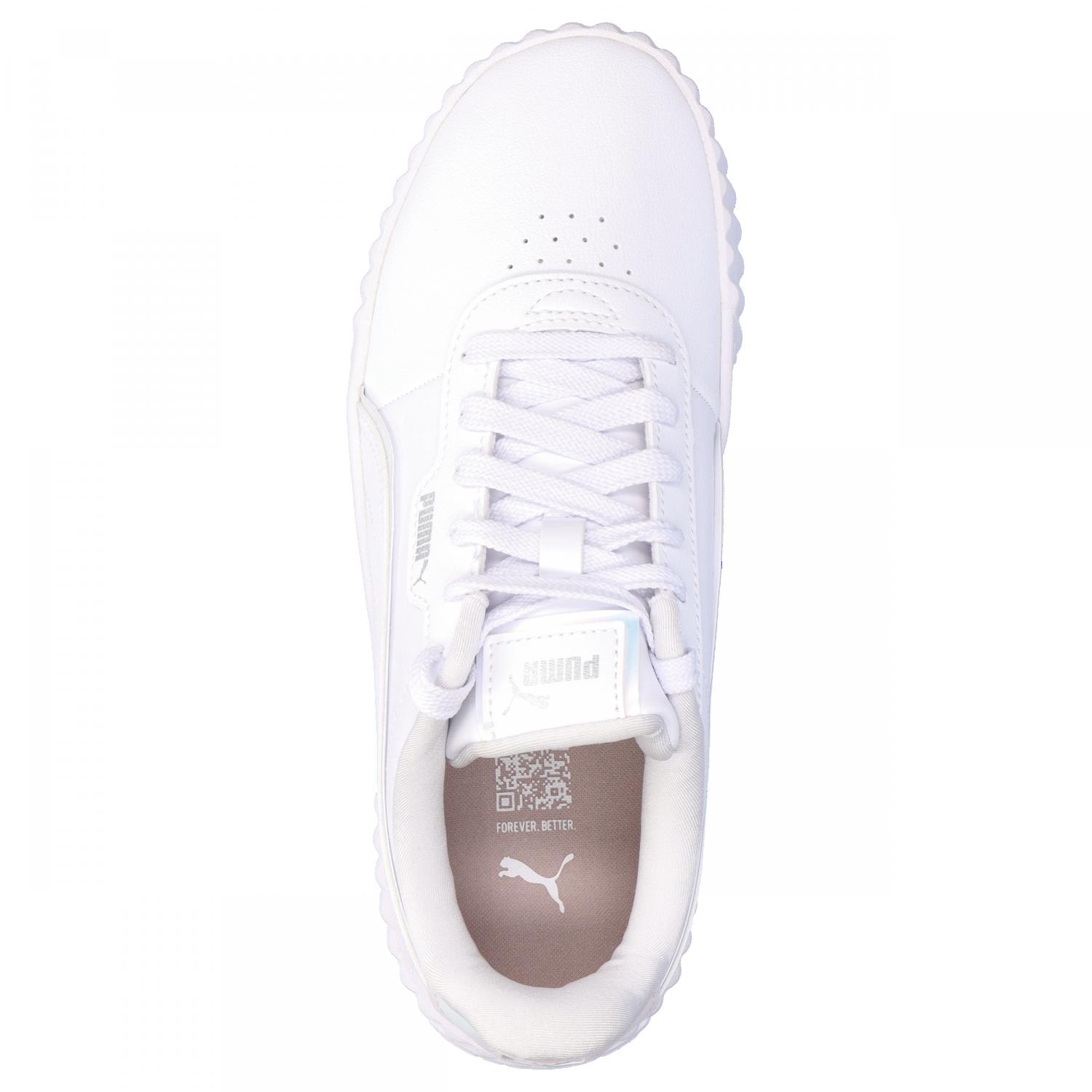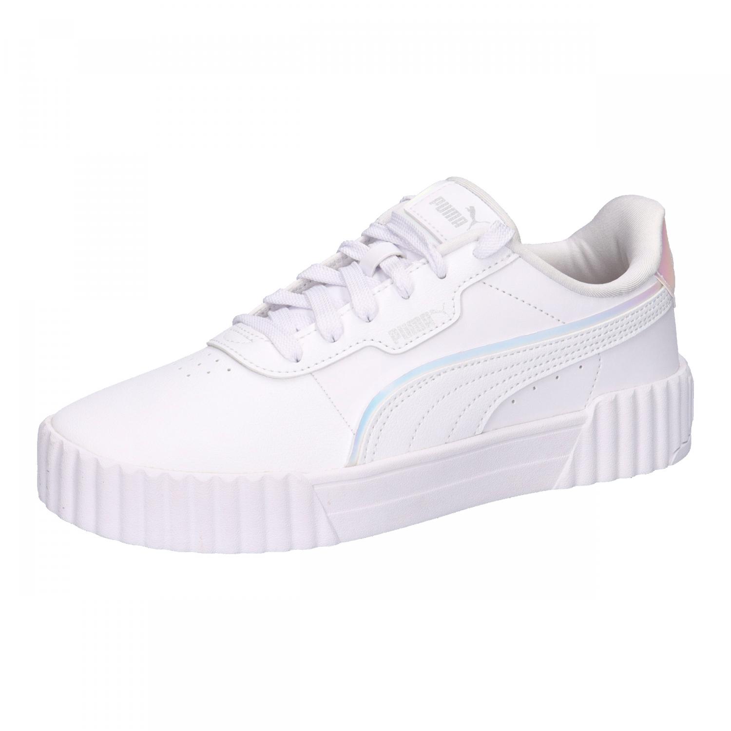 Puma Mädchen Sneaker Carina 3.0 Holo 2.0 Jr. Inspiriert von der Tennisästhetik verkörpert dieser Schuh Weiblichkeit für ein klassisches Modell. Mit Obermaterial aus Leder und hochwertigem Kunstleder und einem Softfoam-Fußbett bietet dieser Schuh die perfekte Mischung aus Komfort und Modernität. Die Softfoam+-Einlegesohle bietet hervorragende Dämpfung und optimalen Komfort für jeden Schritt des Tages. Ein Alleinstellungsmerkmal des Produkts ist die glänzende Ferse. Obermaterial: Sonstiges Material. Futter und Decksohle: Textil. Laufsohle: Sonstiges Material.