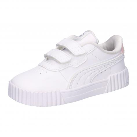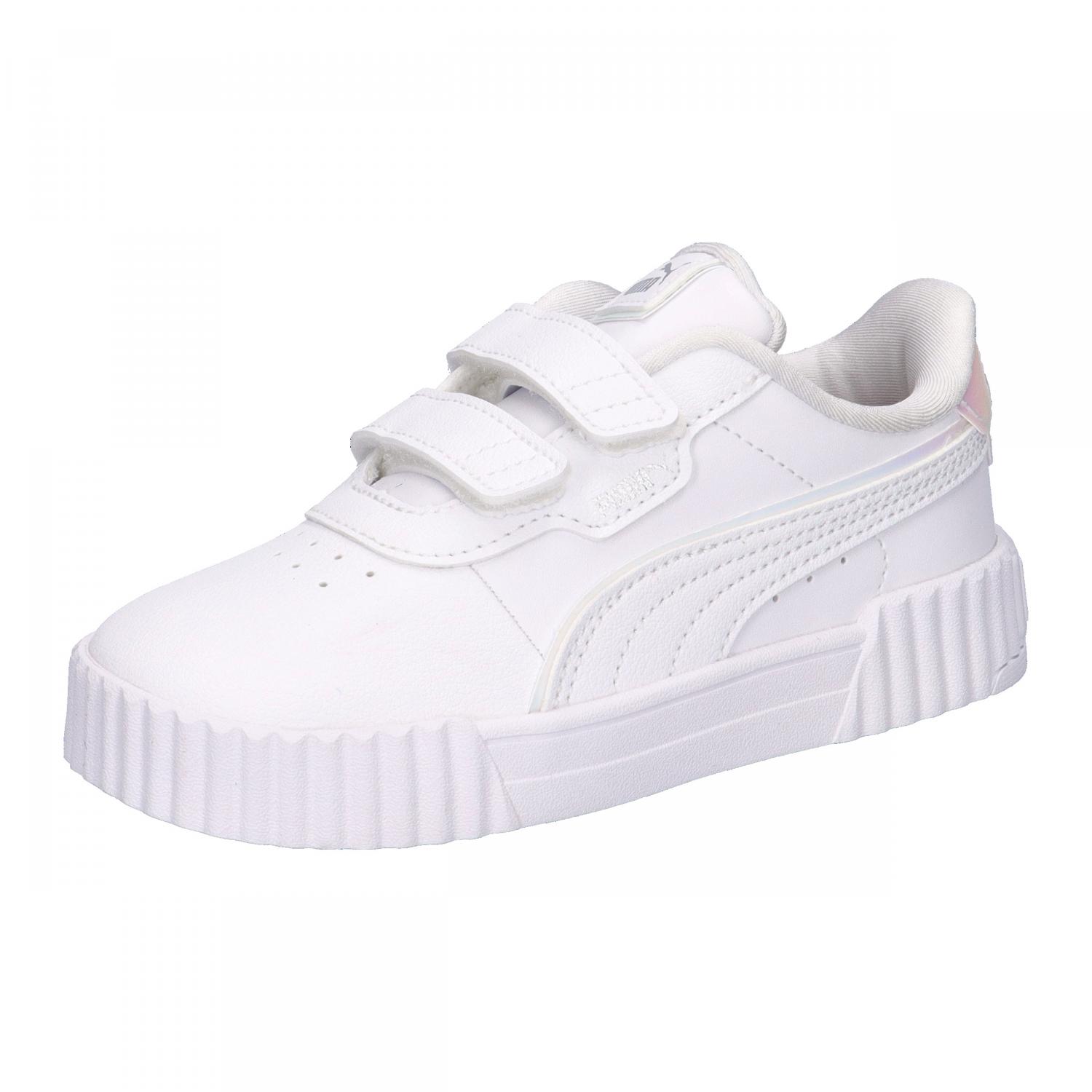Puma Mädchen Sneaker Carina 3.0 Holo 2.0 V Inf. Inspiriert von der Tennisästhetik verkörpert dieser Schuh Weiblichkeit für ein klassisches Modell. Mit Obermaterial aus Leder und hochwertigem Kunstleder und einem Softfoam-Fußbett bietet dieser Schuh die perfekte Mischung aus Komfort und Modernität. Die Softfoam+-Einlegesohle bietet hervorragende Dämpfung und optimalen Komfort für jeden Schritt des Tages. Ein Alleinstellungsmerkmal des Produkts ist die glänzende Ferse. Obermaterial: Sonstiges Material. Futter und Decksohle: Textil. Laufsohle: Sonstiges Material.