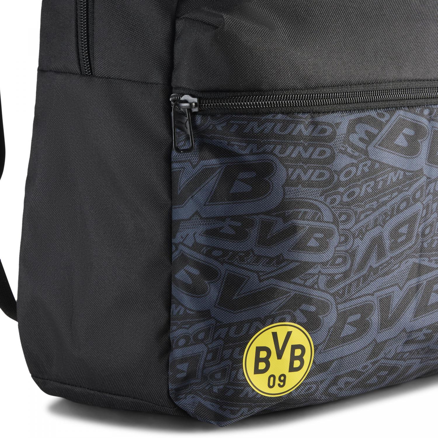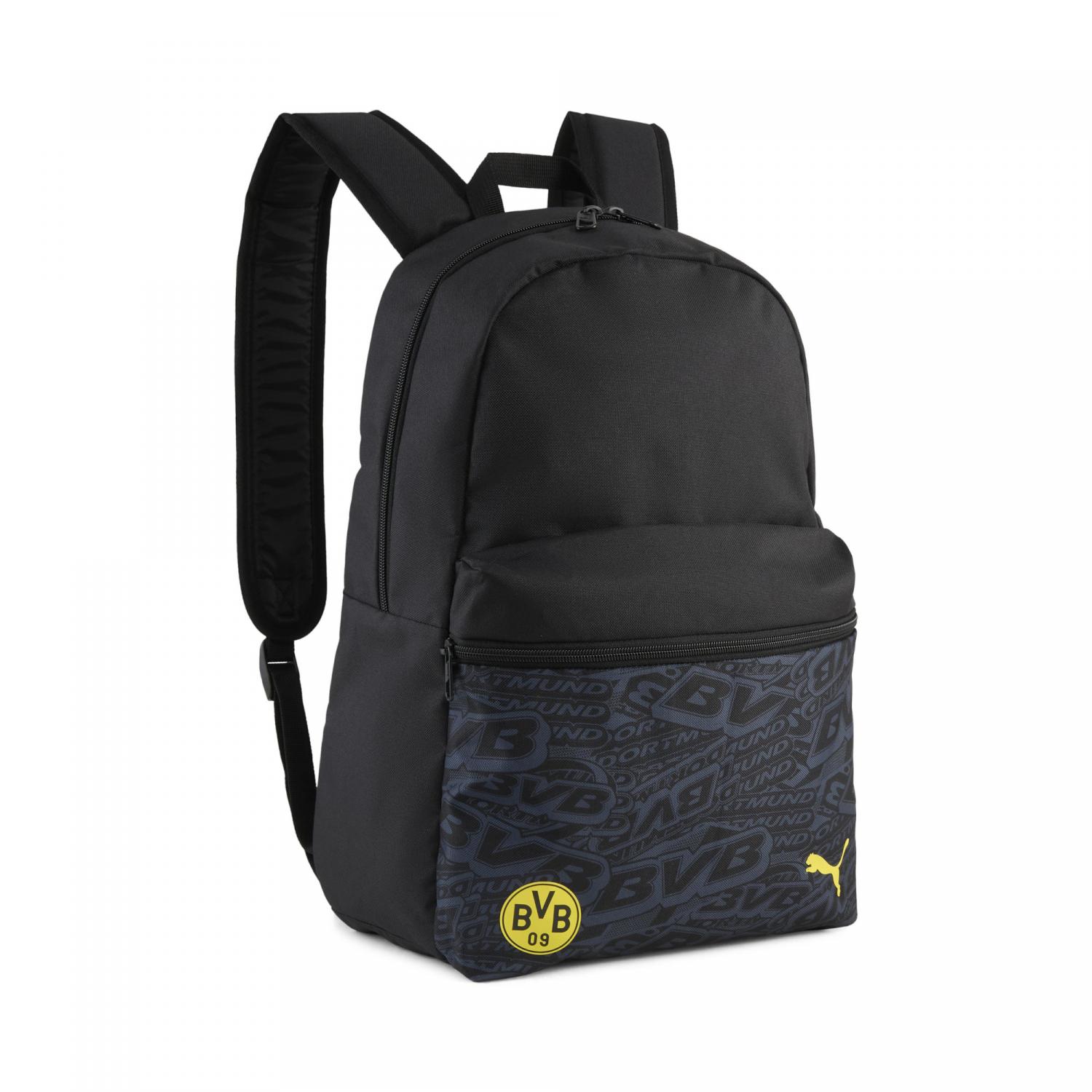 Puma Rucksack Borussia Dortmund Culture Backpack. Hauptfach mit Zwei-Wege-Reißverschluss, Vordertasche mit Reißverschluss, eine Netztasche an der Seite, Futter aus 150D-Polyester mit PU-Beschichtung, verstellbare und gepolsterte Schultergurte mit reflektierender PUMA-Katzenschlaufe, gepolsterte Rückseite, Tragegriff aus Gurtband, markengeschützte Metallreißverschlüsse am Hauptfach und an der Vordertasche, reflektierende Schlaufe und PUMA-Katze auf der Vorderseite. Maße: ca. 41 x 33 x 25 cm. Volumen: ca. 34 Liter. Material: 100% Polyester.