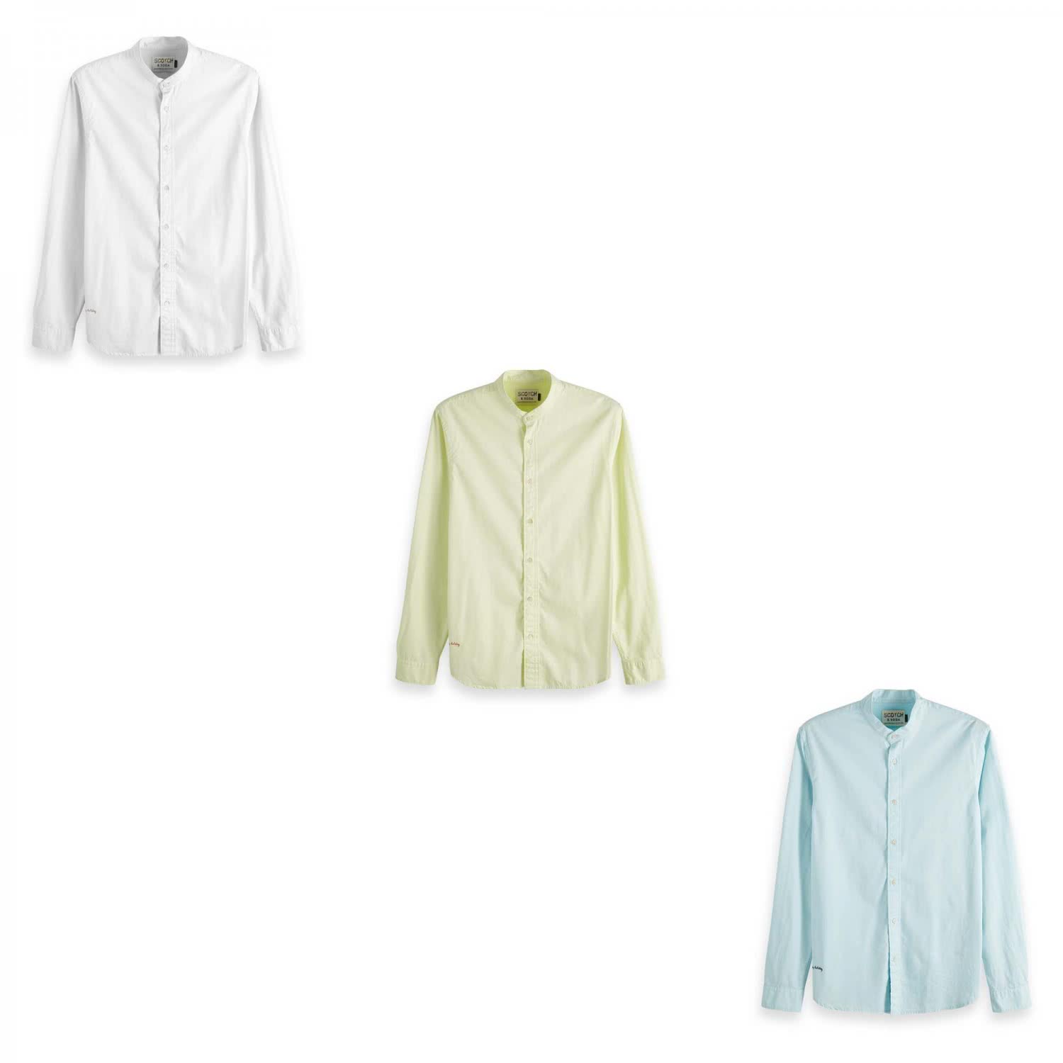 Scotch & Soda Herren Langarmhemd Collarless Shirt. Dieses Baumwollhemd ist in einem weichen Pastellton gehalten und hat einen kleinen gestickten Text an der Seite. Das normal geschnittene Hemd hat einen kragenlosen Halsausschnitt. Material: 100% Baumwolle.
