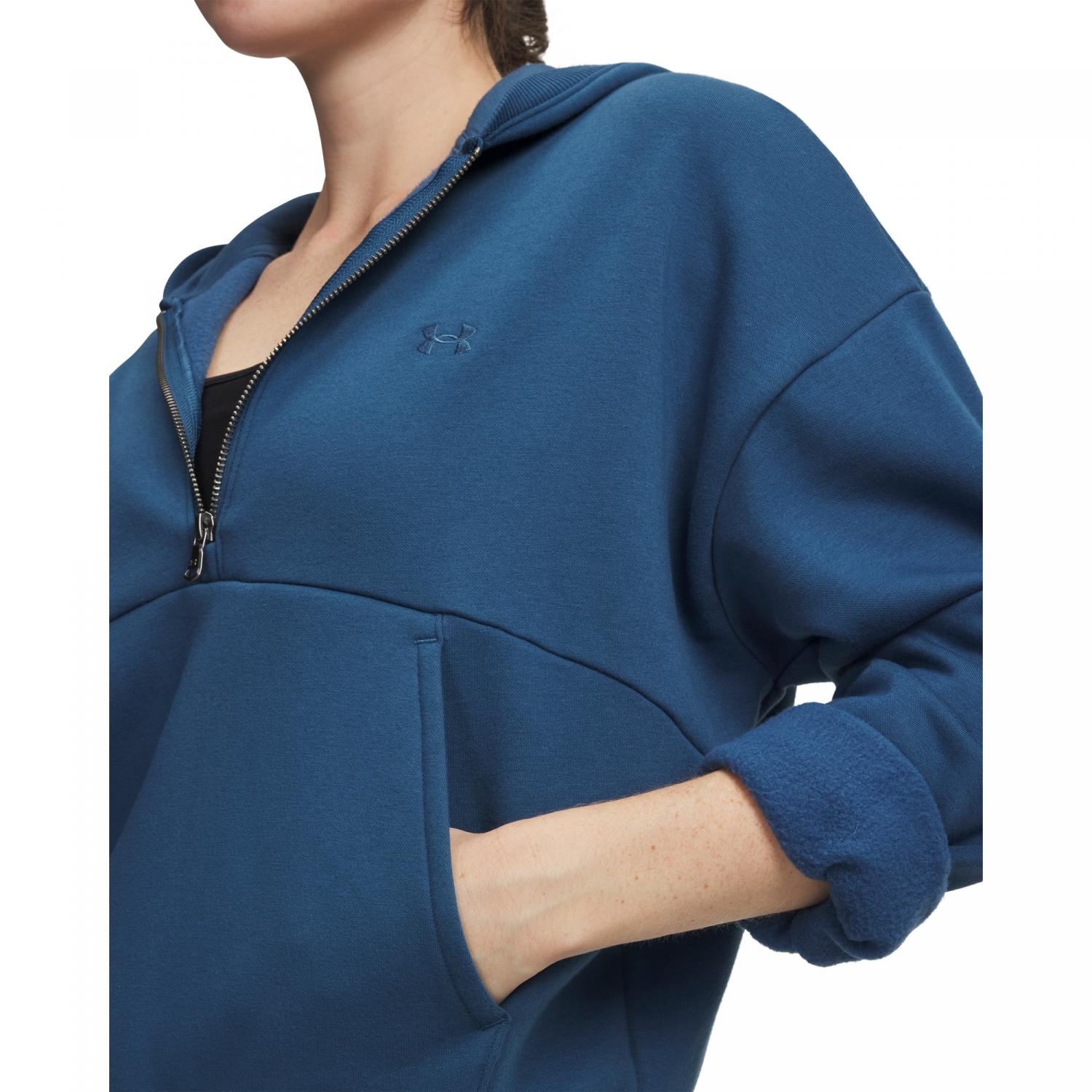Under Armour Damen Kapuzenpullover Icon Fleece. Der Under Armour Damen Kapuzenpullover Icon Fleece kombiniert lässigen Style mit kuscheligem Komfort und ist sowohl für Training als auch für den Alltag ideal geeignet. Das mittelschwere Fleece aus Baumwollmix fühlt sich angenehm weich an und bietet dank aufgerauter Innenseite extra Wärme. Die großzügige, übergroße Passform mit herabgesetzten Schultern sorgt für einen entspannten Look, der sich perfekt für moderne Lagenstyles eignet – unterstützt durch den praktischen ½-Zip auf der Vorderseite. Eine klassische Kängurutasche bietet Platz für kleine Essentials oder wärmt die Hände, während gerippte Bündchen, Saum und Besatz an der Kapuzenöffnung für einen bequemen Sitz sorgen. Zudem wurde das Material des Hauptteils speziell entwickelt und mit der „Fiber Shed“-Testmethode von Under Armour geprüft, um Faserverlust zu reduzieren. Mit seinem Materialmix aus 59 % Baumwolle und 41 % Polyester vereint dieser Hoodie Komfort, Qualität und vielseitigen Stil. Material: 59% Baumwolle, 41% Polyester.