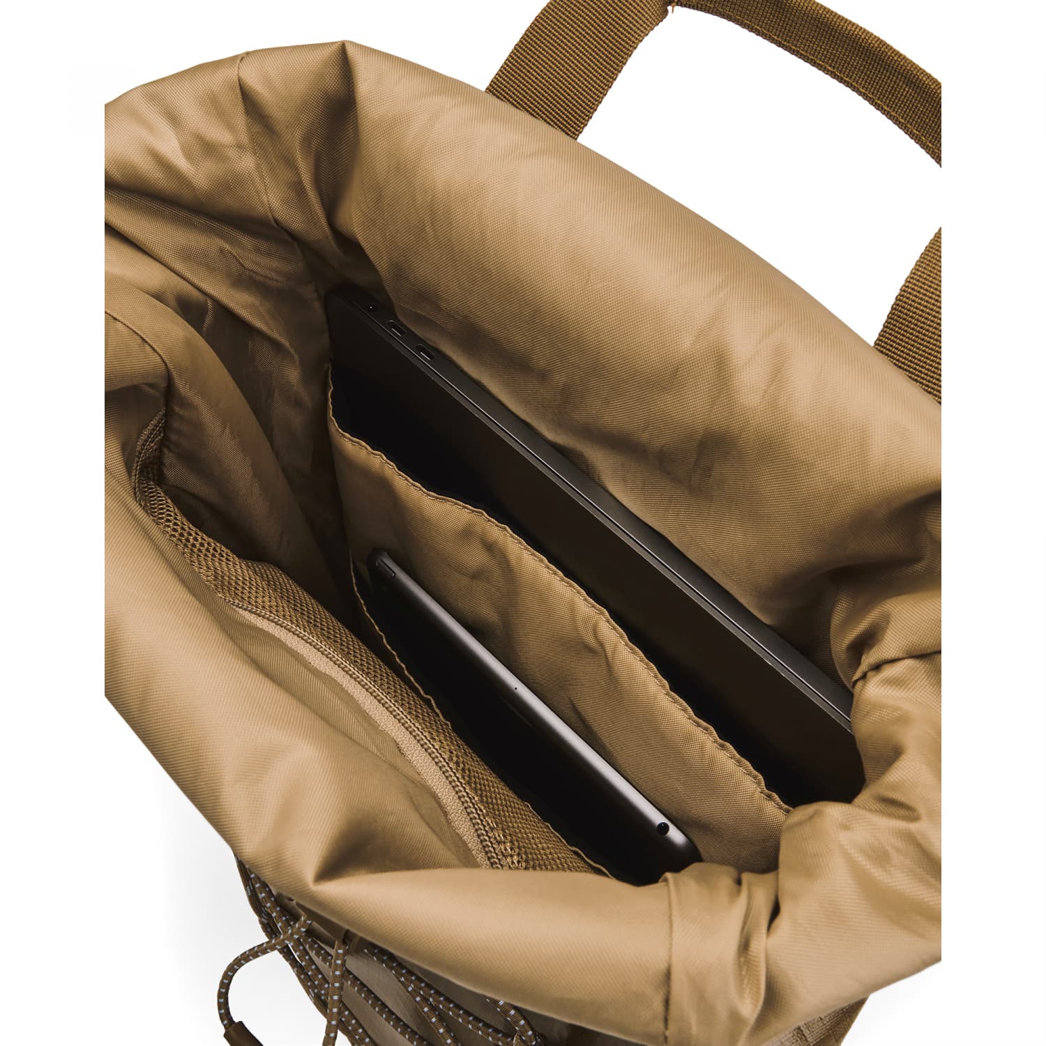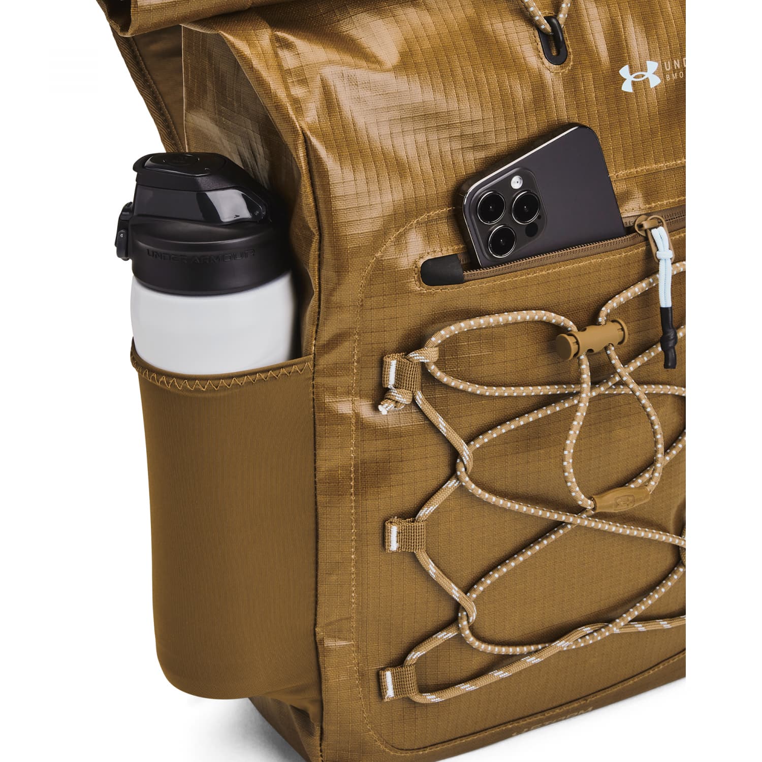 Under Armour Rucksack UA Summit SM Backpack. Mit diesem Rucksack bist du bereit für jedes Abenteuer. Er ist extrem langlebig, wasserabweisend und du kannst all deine Sachen im Handumdrehen darin verstauen und wieder auspacken. Der gepolsterte, atmungsaktive Einsatz auf der Rückseite und die UA LEVELED™ Riemen sorgen für einen besonders bequemen Tragekomfort. Die wasserabweisende UA Storm Technologie hält deine Ausrüstung trocken. Rückenteil und Schulterriemen aus gepolstertem, atmungsaktivem Air-Mesh für ultimativen Komfort. Das LEVELED™-Riemensystem stellt sicher, dass die Riemen gleichmäßig eingestellt sind – für eine ausgewogene Gewichtsverteilung. Rolltop-Design mit Gummizug und Hakenverschluss. Integriertes Laptop-Fach für MacBook Pro® bis zu 13 Zoll oder anderen Laptop von vergleichbarer Größe. Wertsachentasche mit Zip an der Vorderseite und zwei Seitentaschen für Wasserflaschen. Verstellbarer Gummizug auf der Vorderseite zum leichten Verstauen von einer Jacke, einem Paar Schuhe oder einem Ball. Hauptmaterial zu mindestens 90 % aus recyceltem Polyester, Besatz und Verzierungen ausgenommen. Maße: 12 x 43 x 27 cm (B x H x T, gefaltet und mit Gummizug verschlossen). Volumen: 18 Liter. Material: 95% Polyester, 4% Polyamid, 1% Elasthan.