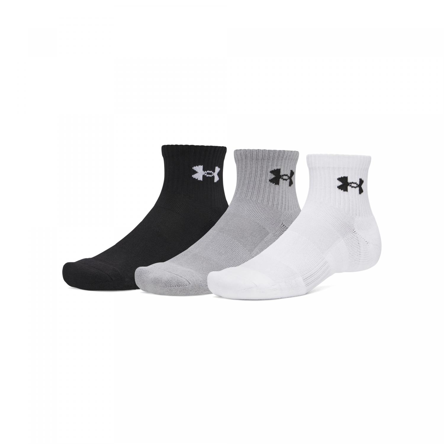 Under Armour Unisex Socken Performance Cotton 3p Quarter. Ja, das sind Baumwollsocken, aber sie leisten mehr als alle anderen Baumwollsocken, die du je getragen hast. Sie leiten Schweiß ab, sodass sich dein Fuß kühler anfühlt, und bieten dir gleichzeitig den unglaublichen Tragekomfort und die Dämpfung, die du von normaler Baumwolle erwartest. Material: 69% Baumwolle, 28% Polyester, 3% Elasthan.
